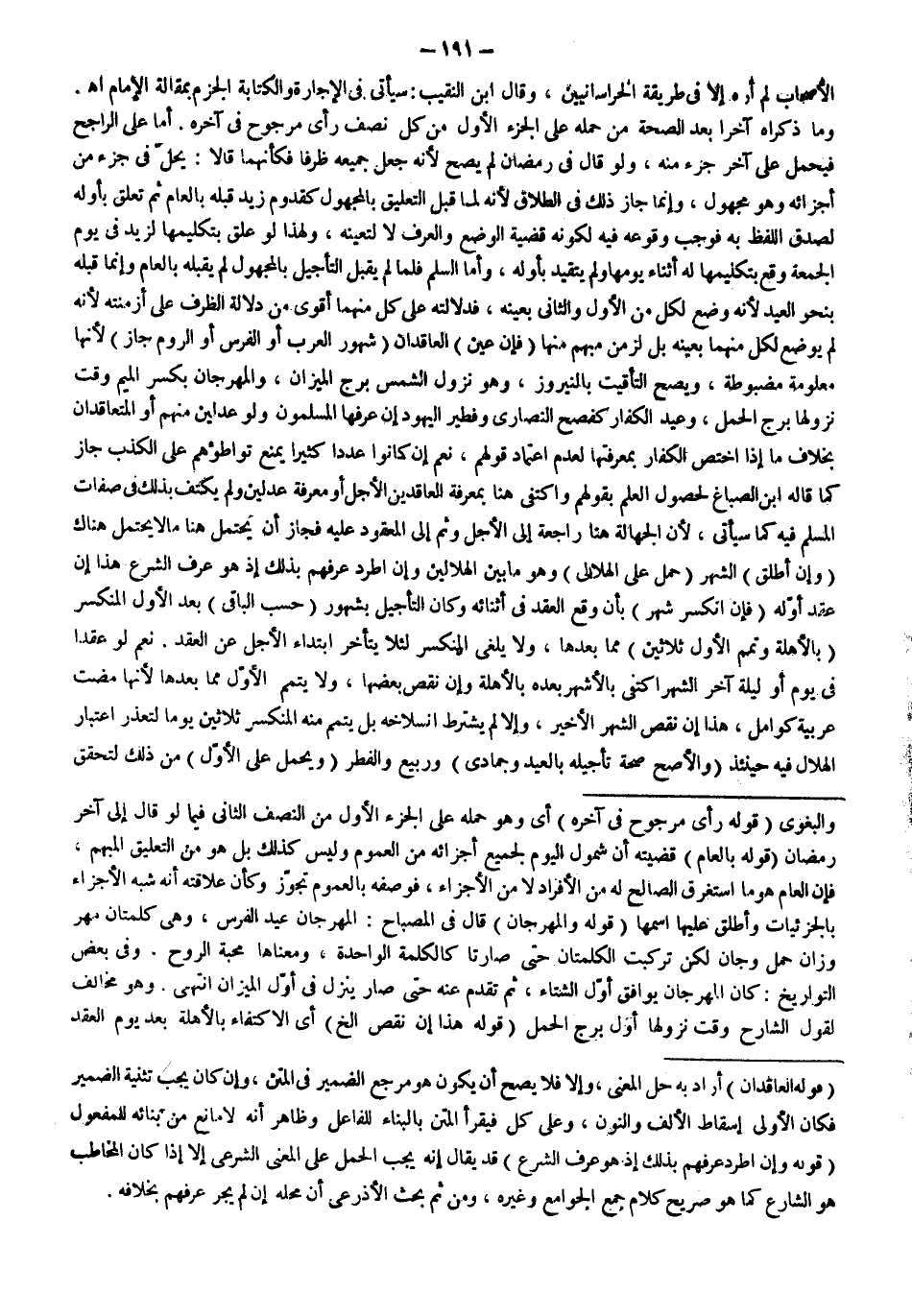 أَمَّا عَلَى الرَّاجِحِ فَيُحْمَلُ عَلَى آخِرِ جُزْءٍ مِنْهُ، وَلَوْ قَالَ فِي رَمَضَانَ لَمْ يَصِحَّ لِأَنَّهُ جَعَلَ جَمِيعَهُ ظَرْفًا فَكَأَنَّهُمَا قَالَا: يَحِلُّ فِي جُزْءٍ مِنْ أَجْزَائِهِ وَهُوَ مَجْهُولٌ، وَإِنَّمَا جَازَ ذَلِكَ فِي الطَّلَاقِ لِأَنَّهُ لَمَّا قَبِلَ التَّعْلِيقَ بِالْمَجْهُولِ كَقُدُومِ زَيْدٍ قَبْلَهُ بِالْعَامِ ثُمَّ تَعَلَّقَ بِأَوَّلِهِ لِصِدْقِ اللَّفْظِ بِهِ فَوَجَبَ وُقُوعُهُ فِيهِ لِكَوْنِهِ قَضِيَّةَ الْوَضْعِ وَالْعُرْفِ لَا لِتَعَيُّنِهِ، وَلِهَذَا لَوْ عَلَّقَ بِتَكْلِيمِهَا لِزَيْدٍ فِي يَوْمِ الْجُمُعَةِ وَقَعَ بِتَكْلِيمِهَا لَهُ أَثْنَاءَ يَوْمِهَا وَلَمْ يَتَقَيَّدْ بِأَوَّلِهِ، وَأَمَّا السَّلَمُ فَلَمَّا لَمْ يَقْبَلْ التَّأْجِيلَ بِالْمَجْهُولِ لَمْ يَقْبَلْهُ بِالْعَامِ وَإِنَّمَا قَبِلَهُ بِنَحْوِ الْعِيدِ لِأَنَّهُ وُضِعَ لِكُلٍّ مِنْ الْأَوَّلِ وَالثَّانِي بِعَيْنِهِ، فَدَلَالَتُهُ عَلَى كُلٍّ مِنْهُمَا أَقْوَى مِنْ دَلَالَةِ الظَّرْفِ عَلَى أَزْمِنَتِهِ لِأَنَّهُ لَمْ يُوضَعْ لِكُلٍّ مِنْهُمَا بِعَيْنِهِ بَلْ لِزَمَنٍ مُبْهَمٍ مِنْهَا (فَإِنْ) (عَيَّنَ) الْعَاقِدَانِ (شُهُورَ الْعَرَبِ أَوْ الْفُرْسِ أَوْ الرُّومِ) (جَازَ) لِأَنَّهَا مَعْلُومَةٌ مَضْبُوطَةٌ، وَيَصِحُّ التَّأْقِيتُ بِالنَّيْرُوزِ، وَهُوَ نُزُولُ الشَّمْسِ بُرْجَ الْمِيزَانِ، وَالْمِهْرَجَانُ بِكَسْرِ الْمِيمِ وَقْتُ نُزُولِهَا بُرْجَ الْحَمَلِ، وَعِيدُ الْكُفَّارِ كَفِصْحِ النَّصَارَى وَفَطِيرِ الْيَهُودِ إنْ عَرَفَهَا الْمُسْلِمُونَ وَلَوْ عَدْلَيْنِ مِنْهُمْ أَوْ الْمُتَعَاقِدَانِ بِخِلَافِ مَا إذَا اُخْتُصَّ الْكُفَّارُ بِمَعْرِفَتِهَا لِعَدَمِ اعْتِمَادِ قَوْلِهِمْ، نَعَمْ إنْ كَانُوا عَدَدًا كَثِيرًا يُمْنَعُ تَوَاطُؤُهُمْ عَلَى الْكَذِبِ جَازَ كَمَا قَالَهُ ابْنُ الصَّبَّاغِ لِحُصُولِ الْعِلْمِ بِقَوْلِهِمْ وَاكْتَفَى هُنَا بِمَعْرِفَةِ الْعَاقِدَيْنِ الْأَجَلَ أَوْ مَعْرِفَةِ عَدْلَيْنِ وَلَمْ يَكْتَفِ بِذَلِكَ فِي صِفَاتِ الْمُسْلَمِ فِيهِ كَمَا سَيَأْتِي، لِأَنَّ الْجَهَالَةَ هُنَا رَاجِعَةٌ إلَى الْأَجَلِ وَثَمَّ إلَى الْمَعْقُودِ عَلَيْهِ فَجَازَ أَنْ يَحْتَمِلَ هُنَا مَا لَا يَحْتَمِلُ هُنَاكَ (وَإِنْ أَطْلَقَ) الشَّهْرَ (حُمِلَ عَلَى الْهِلَالِيِّ) وَهُوَ مَا بَيْنَ الْهِلَالَيْنِ وَإِنْ اطَّرَدَ عُرْفُهُمْ بِذَلِكَ إذْ هُوَ عُرْفُ الشَّرْعِ هَذَا إنْ عَقَدَ أَوَّلَهُ (فَإِنْ انْكَسَرَ شَهْرٌ) بِأَنْ وَقَعَ الْعَقْدُ فِي أَثْنَائِهِ وَكَانَ التَّأْجِيلُ بِشُهُورٍ (حَسَبَ الْبَاقِي) بَعْدَ الْأَوَّلِ الْمُنْكَسِرِ (بِالْأَهِلَّةِ وَتَمَّمَ الْأَوَّلَ ثَلَاثِينَ) مِمَّا بَعْدَهَا، وَلَا يُلْغِي الْمُنْكَسِرَ لِئَلَّا يَتَأَخَّرَ ابْتِدَاءُ الْأَجَلِ عَنْ الْعَقْدِ.