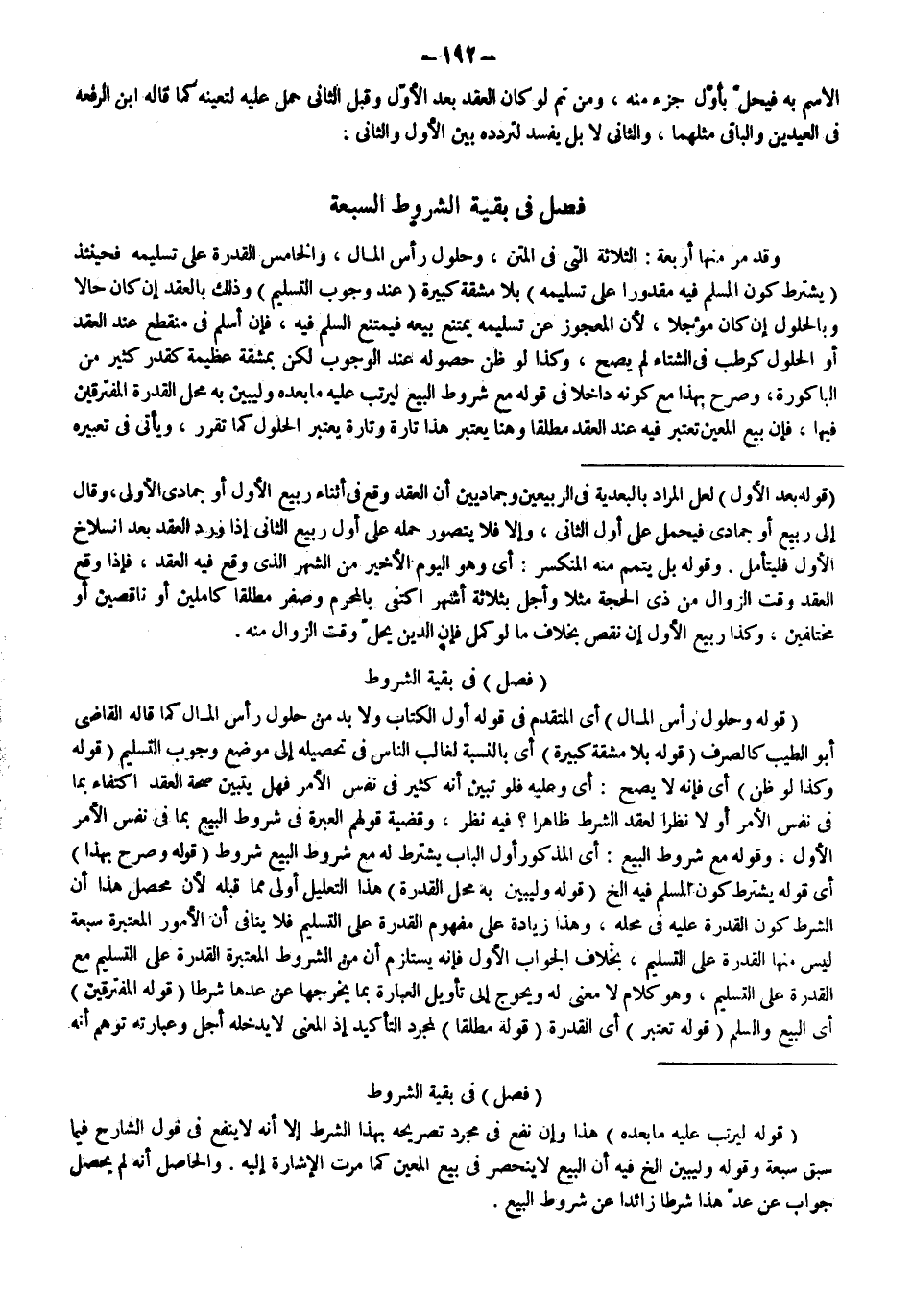 فَصْلٌ فِي بَقِيَّةِ الشُّرُوطِ السَّبْعَةِ وَقَدْ مَرَّ مِنْهَا أَرْبَعَةٌ: الثَّلَاثَةُ الَّتِي فِي الْمَتْنِ، وَحُلُولُ رَأْسِ الْمَالِ، وَالْخَامِسُ الْقُدْرَةُ عَلَى تَسْلِيمِهِ فَحِينَئِذٍ (يُشْتَرَطُ كَوْنُ الْمُسْلَمِ فِيهِ مَقْدُورًا عَلَى تَسْلِيمِهِ) بِلَا مَشَقَّةٍ كَبِيرَةٍ (عِنْدَ وُجُوبِ التَّسْلِيمِ) وَذَلِكَ بِالْعَقْدِ إنْ كَانَ حَالًّا وَبِالْحُلُولِ إنْ كَانَ مُؤَجَّلًا، لِأَنَّ الْمَعْجُوزَ عَنْ تَسْلِيمِهِ يَمْتَنِعُ بَيْعُهُ فَيَمْتَنِعُ السَّلَمُ فِيهِ، فَإِنْ أَسْلَمَ فِي مُنْقَطِعٍ عِنْدَ الْعَقْدِ أَوْ الْحُلُولِ كَرُطَبٍ فِي الشِّتَاءِ لَمْ يَصِحَّ، وَكَذَا لَوْ ظَنَّ حُصُولَهُ عِنْدَ الْوُجُوبِ لَكِنْ بِمَشَقَّةٍ عَظِيمَةٍ كَقَدْرِ كَثِيرٍ مِنْ الْبَاكُورَةِ، وَصَرَّحَ بِهَذَا مَعَ كَوْنِهِ دَاخِلًا فِي قَوْلِهِ مَعَ شُرُوطِ الْبَيْعِ لِيُرَتِّبَ عَلَيْهِ مَا بَعْدَهُ وَلِيُبَيِّنَ بِهِ مَحَلَّ الْقُدْرَةِ الْمُفْتَرِقَيْنِ فِيهَا، فَإِنَّ بَيْعَ الْمُعَيَّنِ تُعْتَبَرُ فِيهِ عِنْدَ الْعَقْدِ مُطْلَقًا وَهُنَا يُعْتَبَرُ هَذَا تَارَةً وَتَارَةً يُعْتَبَرُ الْحُلُولُ كَمَا تَقَرَّرَ، وَيَأْتِي فِي تَعْبِيرِهِ