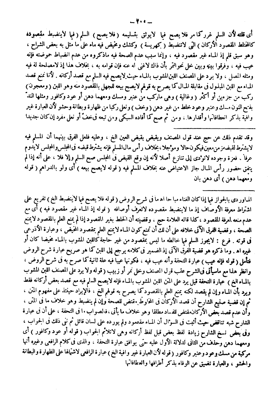 وَمَا ذَكَرَهُ هُوَ قَضِيَّةُ الْفَرْقِ الْآتِي إذْ الضَّمِيرُ فِي كَلَامِهِ يَرْجِعُ إلَى اللَّبَنِ كَمَا هُوَ صَرِيحُ عِبَارَةِ شَرْحِ الرَّوْضِ فَتَأَمَّلْ. (قَوْلُهُ: فَإِنَّهُ عَيْبٌ) عِبَارَةُ التُّحْفَةِ وَأَنَّهُ عَيْبٌ فِيهِ، فَكَوْنُهَا عَيْبًا فِيهِ عِلَّةٌ ثَانِيَةٌ كَمَا صَرَّحَ بِهِ فِي شَرْحِ الرَّوْضِ، وَانْظُرْ هَذَا مَعَ مَا سَيَأْتِي فِي الشَّرْحِ عَقِبَ قَوْلِ الْمُصَنِّفِ وَخَلِّ تَمْرٍ أَوْ زَبِيبٍ. (قَوْلُهُ: وَلَا يَرِدُ عَلَى الْمُصَنِّفِ اللَّبَنُ الْمَشُوبُ بِالْمَاءِ إلَخْ) عِبَارَةُ التُّحْفَةِ قِيلَ يَرِدُ عَلَى الْمَتْنِ اللَّبَنُ الْمَشُوبُ بِالْمَاءِ فَإِنَّهُ لَا يَصِحُّ السَّلَمُ فِيهِ مَعَ قَصْدِ بَعْضِ أَرْكَانِهِ فَقَطْ وَيُرَدُّ بِأَنَّ الْمَاءَ وَإِنْ لَمْ يُقْصَدْ لَكِنَّهُ يَمْنَعُ الْعِلْمَ بِالْمَقْصُودِ كَمَا يُصَرِّحُ بِهِ قَوْلُهُمْ إلَخْ، فَالْإِيرَادُ حِينَئِذٍ عَلَى مَفْهُومِ الْمَتْنِ، ثُمَّ إنَّ قَضِيَّةَ صَنِيعِ الشَّارِحِ أَنَّ قَصْدَ الْأَرْكَانِ فِي الْمَخْلُوطِ مُقْتَضٍ لِلصِّحَّةِ وَإِنْ لَمْ يَنْضَبِطْ وَهُوَ خِلَافُ مَا فِي الْمَتْنِ، وَأَنَّ عَدَمَ قَصْدِ بَعْضِ الْأَرْكَانِ مُقْتَضٍ لِلْفَسَادِ مُطْلَقًا وَهُوَ خِلَافُ مَا يَأْتِي، فَالصَّوَابُ مَا فِي التُّحْفَةِ، عَلَى أَنَّ فِي عِبَارَةِ الشَّارِحِ شِبْهَ تَنَاقُضٍ حَيْثُ أَثْبَتَ فِي السُّؤَالِ أَنَّ الْمَاءَ مَقْصُودٌ وَلَمْ يُورِدْهُ عَلَى لِسَانِ قَائِلٍ ثُمَّ نَفَى ذَلِكَ فِي الْجَوَابِ، وَفِي بَعْضِ نُسَخِ الشَّارِحِ زِيَادَةُ لَفْظِ بَعْضٍ قَبْلَ لَفْظِ أَرْكَانِهِ وَهِيَ لَا تُلَائِمُ الْجَوَابَ. (قَوْلُهُ: أَوْ عُودٍ وَكَافُورٍ) أَيْ وَمَعَهُمَا دُهْنٌ وَحُذِفَ مِنْ الثَّانِي لِدَلَالَةِ الْأَوَّلِ عَلَيْهِ حَتَّى يُوَافِقَ عِبَارَةَ التُّحْفَةِ، وَاَلَّذِي فِي كَلَامِ الرَّافِعِيِّ وَغَيْرِهِ أَنَّهَا مُرَكَّبَةٌ مِنْ مِسْكٍ وَعُودٍ وَعَنْبَرٍ وَكَافُورٍ. (قَوْلُهُ: لِأَنَّ الْعِبَارَةَ غَيْرُ وَافِيَةٍ إلَخْ) عِبَارَةُ الرَّافِعِيِّ لِاشْتِمَالِهَا عَلَى الظِّهَارَةِ وَالْبِطَانَةِ وَالْحَشْوِ، وَالْعِبَارَةُ تَضِيقُ عَنْ الْوَفَاءِ بِذِكْرِ أَطْرَافِهَا وَانْعِطَافَاتِهَا