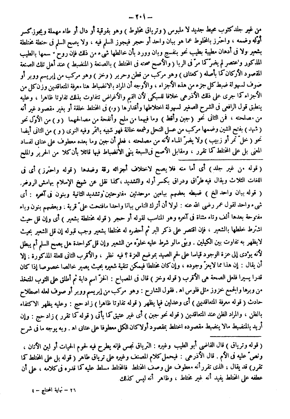 فَقَوْلُ الشَّارِحِ: وَهُوَ مُرَكَّبٌ مِنْ إبْرَيْسَمَ وَوَبَرٍ أَوْ صُوفٍ لَعَلَّهُ اصْطِلَاحٌ حَادِثٌ (قَوْلُهُ: مَعْرِفَةُ الْمُتَعَاقِدَيْنِ) أَيْ وَعَدْلَيْنِ فِيمَا يَظْهَرُ (قَوْلُهُ: تَفَاوُتًا ظَاهِرًا) زَادَ حَجّ: وَعَلَيْهِ يَظْهَرُ الِاكْتِفَاءُ بِالظَّنِّ، وَالْمُرَادُ الظَّنُّ عِنْدَ الْمُتَعَاقِدَيْنِ (قَوْلُهُ: نَحْوُ جُبْنٍ) أَيْ غَيْرِ عَتِيقٍ كَمَا يَأْتِي (قَوْلُهُ: كَمَا تَقَرَّرَ) زَادَ حَجّ: وَإِنْ أُرِيدَ بِالْمُنْضَبِطِ مَا لَا يَنْضَبِطُ مَقْصُودُهُ اخْتَلَطَ بِمَقْصُودٍ أَوْ لَا كَانَ الْكُلُّ مَعْطُوفًا عَلَى عَتَّابِيٍّ اهـ.