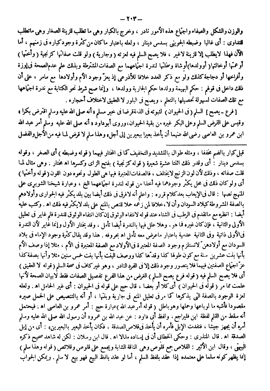 (قَوْلُهُ: فَرْعٌ يَصِحُّ السَّلَمُ) الْغَرَضُ مِنْ هَذَا الْفَرْعِ تَفْصِيلُ الصِّفَاتِ فَقَطْ لَا بَيَانُ الصِّحَّةِ لِأَنَّهَا عُلِمَتْ مِمَّا مَرَّ (قَوْلُهُ: فِي الْحَيَوَانِ) أَيْ كُلًّا أَوْ بَعْضًا، قَالَ حَجّ عَلَى قَوْلِهِ فِي الْحَيَوَانِ: أَيْ غَيْرِ الْحَامِلِ اهـ.
