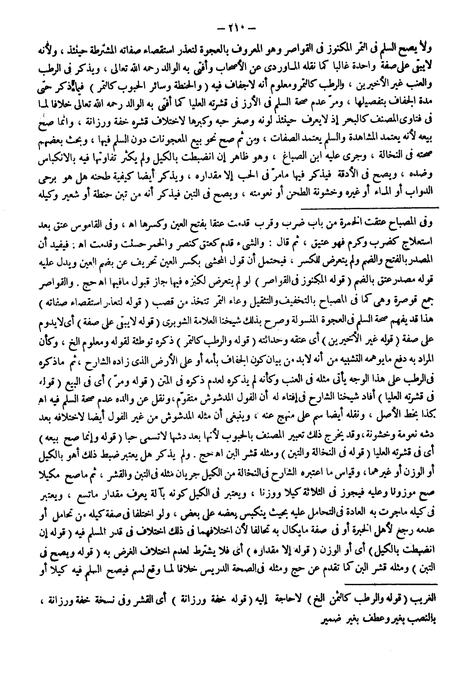 وَلَا يَصِحُّ السَّلَمُ فِي التَّمْرِ الْمَكْنُوزِ فِي الْقَوَاصِرِ وَهُوَ الْمَعْرُوفُ بِالْعَجْوَةِ لِتَعَذُّرِ اسْتِقْصَاءِ صِفَاتِهِ الْمُشْتَرَطَةِ حِينَئِذٍ، وَلِأَنَّهُ لَا يَبْقَى عَلَى صِفَةٍ وَاحِدَةٍ غَالِبًا كَمَا نَقَلَهُ الْمَاوَرْدِيُّ عَنْ الْأَصْحَابِ وَأَفْتَى بِهِ الْوَالِدُ - رَحِمَهُ اللَّهُ تَعَالَى -، وَيَذْكُرُ فِي الرُّطَبِ وَالْعِنَبِ غَيْرَ الْأَخِيرَيْنِ، وَالرُّطَبُ كَالتَّمْرِ وَمَعْلُومٌ أَنَّهُ لَا جَفَافَ فِيهِ (وَالْحِنْطَةُ وَسَائِرُ الْحُبُوبِ كَالتَّمْرِ) فِيمَا ذَكَرَ حَتَّى مُدَّةِ الْجَفَافِ بِتَفْصِيلِهَا، وَمَرَّ عَدَمُ صِحَّةِ السَّلَمِ فِي الْأُرْزِ فِي قِشْرَتِهِ الْعُلْيَا كَمَا أَفْتَى بِهِ الْوَالِدُ - رَحِمَهُ اللَّهُ تَعَالَى - خِلَافًا لِمَا فِي فَتَاوَى الْمُصَنِّفِ كَالْبَحْرِ إذْ لَا يُعْرَفُ حِينَئِذٍ لَوْنُهُ وَصِغَرُ حَبِّهِ وَكِبَرُهَا لِاخْتِلَافِ قِشْرِهِ خِفَّةً وَرَزَانَةً، وَإِنَّمَا صَحَّ بَيْعُهُ لِأَنَّهُ يَعْتَمِدُ الْمُشَاهَدَةَ وَالسَّلَمُ يَعْتَمِدُ الصِّفَاتِ، وَمِنْ ثَمَّ صَحَّ نَحْوُ بَيْعِ الْمَعْجُونَاتِ دُونَ السَّلَمِ فِيهَا، وَبَحَثَ بَعْضُهُمْ صِحَّتَهُ فِي النُّخَالَةِ، وَجَرَى عَلَيْهِ ابْنُ الصَّبَّاغِ.