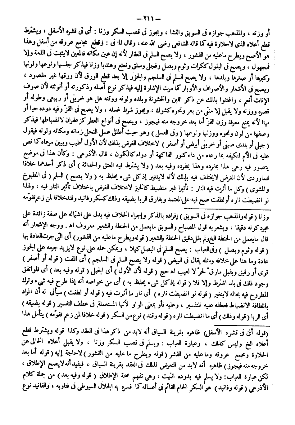 أَوْ وَزْنَهُ، وَالْمَذْهَبُ جَوَازُهُ فِي السَّوِيقِ وَالنَّشَا، وَيَجُوزُ فِي قَصَبِ السُّكَّرِ وَزْنًا: أَيْ فِي قِشْرِهِ الْأَسْفَلِ، وَيُشْتَرَطُ قَطْعُ أَعْلَاهُ الَّذِي لَا حَلَاوَةَ فِيهِ كَمَا قَالَهُ الشَّافِعِيُّ - رَضِيَ اللَّهُ عَنْهُ -، وَقَالَ الْمُزَنِيّ: وَقَطْعُ مَجَامِعِ عُرُوقِهِ مِنْ أَسْفَلَ وَهَذَا هُوَ الْأَصَحُّ وَيَطْرَحُ مَا عَلَيْهِ مِنْ الْقُشُورِ، وَلَا يَصِحُّ السَّلَمُ فِي الْعَقَارِ لِأَنَّهُ إنْ عَيَّنَ مَكَانَهُ فَالْمُعَيَّنُ لَا يَثْبُتُ فِي الذِّمَّةِ وَإِلَّا فَمَجْهُولٌ، وَيَصِحُّ فِي الْبُقُولِ كَكُرَّاتٍ وَثُومٍ وَبَصَلٍ وَفُجْلٍ وَسِلْقٍ وَنُعْنُعٍ وَهِنْدَبًا وَزْنًا فَيَذْكُرُ جِنْسَهَا وَنَوْعَهَا وَلَوْنَهَا وَكِبَرَهَا أَوْ صِغَرَهَا وَبَلَدَهَا، وَلَا يَصِحُّ السَّلَمُ فِي السَّلْجَمِ وَالْجَزَرِ إلَّا بَعْدَ قَطْعِ الْوَرَقِ لِأَنَّ وَرَقَهَا غَيْرُ مَقْصُودٍ، وَيَصِحُّ فِي الْأَشْعَارِ وَالْأَصْوَافِ وَالْأَوْبَارِ كَمَا مَرَّتْ الْإِشَارَةُ إلَيْهِ فَيَذْكُرُ نَوْعَ أَصْلِهِ وَذُكُورَتَهُ أَوْ أُنُوثَتَهُ لِأَنَّ صُوفَ الْإِنَاثِ أَنْعَمُ، وَاغْتَنَوْا بِذَلِكَ عَنْ ذِكْرِ اللَّبَنِ وَالْخُشُونَةِ وَبَلَدِهِ وَلَوْنِهِ وَوَقْتِهِ هَلْ هُوَ خَرِيفِيٌّ أَوْ رَبِيعِيٌّ وَطُولِهِ أَوْ قِصَرِهِ وَوَزْنِهِ وَلَا يُقْبَلُ إلَّا مُنَقًّى مِنْ بَعْرٍ وَنَحْوِهِ كَشَوْكٍ، وَيَجُوزُ شَرْطُ غَسْلِهِ، وَلَا يَصِحُّ فِي الْقَزِّ وَفِيهِ دُودُهُ حَيًّا أَوْ مَيِّتًا لِأَنَّهُ يَمْنَعُ مَعْرِفَةَ وَزْنِ الْقَزِّ أَمَّا بَعْدَ خُرُوجِهِ مِنْهُ فَيَجُوزُ، وَيَصِحُّ فِي أَنْوَاعِ الْعِطْرِ كَزَعْفَرَانٍ لِانْضِبَاطِهَا فَيَذْكُرُ وَصْفَهَا مِنْ لَوْنٍ وَنَحْوِهِ وَوَزْنِهَا وَنَوْعِهَا.