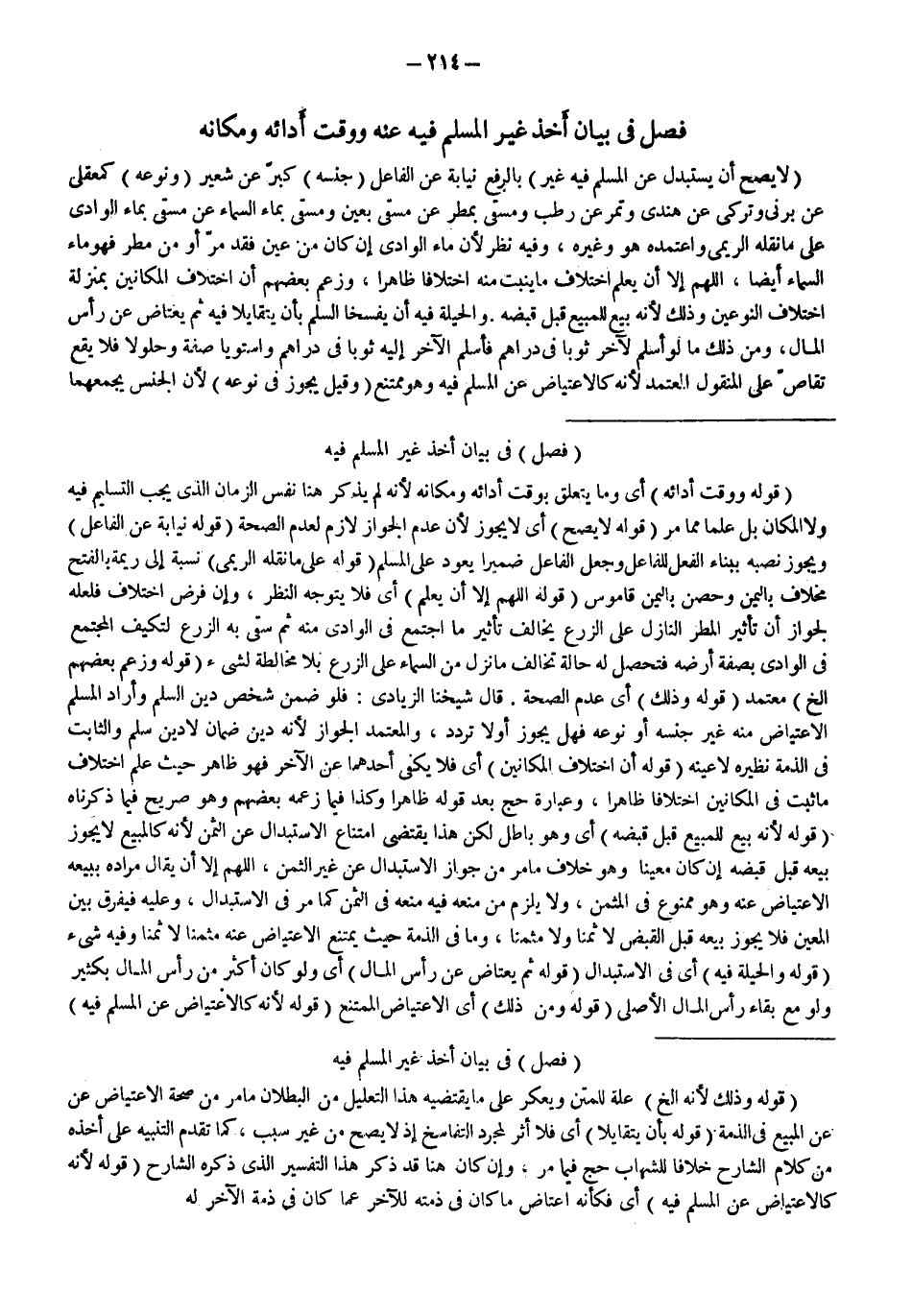ـــــــــــــــــــــــــــــSفَصْلٌ) فِي بَيَانِ أَخْذِ غَيْرِ الْمُسْلَمِ فِيهِ (قَوْلُهُ: وَوَقْتَ أَدَائِهِ) أَيْ وَمَا يَتَعَلَّقُ بِوَقْتِ أَدَائِهِ وَمَكَانِهِ لِأَنَّهُ لَمْ يَذْكُرْ هُنَا نَفْسَ الزَّمَانِ الَّذِي يَجِبُ التَّسْلِيمُ فِيهِ وَلَا الْمَكَانَ بَلْ عِلْمًا مِمَّا مَرَّ (قَوْلُهُ: لَا يَصِحُّ) أَيْ لَا يَجُوزُ لِأَنَّ عَدَمَ الْجَوَازِ لَازِمٌ لِعَدَمِ الصِّحَّةِ (قَوْلُهُ: نِيَابَةً عَنْ الْفَاعِلِ) وَيَجُوزُ نَصْبُهُ بِبِنَاءِ الْفِعْلِ لِلْفَاعِلِ وَجَعْلِ الْفَاعِلِ ضَمِيرًا يَعُودُ عَلَى الْمُسَلَّمِ (قَوْلُهُ: عَلَى مَا نَقَلَهُ الرِّيمِيُّ) نِسْبَةً إلَى رَيْمَةَ بِالْفَتْحِ مِخْلَافٌ بِالْيَمَنِ وَحِصْنٌ بِالْيَمَنِ قَامُوسٌ (قَوْلُهُ: اللَّهُمَّ إلَّا أَنْ يَعْلَمَ) أَيْ فَلَا يُتَوَجَّهُ النَّظَرُ، وَإِنْ فُرِضَ اخْتِلَافٌ فَلَعَلَّهُ لِجَوَازِ أَنَّ تَأْثِيرَ الْمَطَرِ النَّازِلِ عَلَى الزَّرْعِ يُخَالِفُ تَأْثِيرَ مَا اجْتَمَعَ فِي الْوَادِي مِنْهُ ثُمَّ سُقِيَ بِهِ الزَّرْعُ لِتَكَيُّفِ الْمُجْتَمِعِ فِي الْوَادِي بِصِفَةِ أَرْضِهِ فَتَحْصُلُ لَهُ حَالَةٌ تُخَالِفُ مَا نَزَلَ مِنْ السَّمَاءِ عَلَى الزَّرْعِ بِلَا مُخَالَطَةٍ لِشَيْءٍ (قَوْلُهُ: وَزَعَمَ بَعْضُهُمْ إلَخْ) مُعْتَمَدٌ (قَوْلُهُ: وَذَلِكَ) أَيْ عَدَمُ الصِّحَّةِ. قَالَ شَيْخُنَا الزِّيَادِيُّ: فَلَوْ ضَمِنَ شَخْصٌ دَيْنَ السَّلَمِ وَأَرَادَ الْمُسَلِّمُ الِاعْتِيَاضَ مِنْهُ غَيْرَ جِنْسِهِ أَوْ نَوْعِهِ فَهَلْ يَجُوزُ أَوْ لَا؟ تَرَدُّدٌ، وَالْمُعْتَمَدُ الْجَوَازُ لِأَنَّهُ دَيْنُ ضَمَانٍ لَا دَيْنُ سَلَمٍ وَالثَّابِتُ فِي الذِّمَّةِ نَظِيرُهُ لَا عَيْنُهُ (قَوْلُهُ: أَنَّ اخْتِلَافَ الْمَكَانَيْنِ) أَيْ فَلَا يَكْفِي أَحَدُهُمَا عَنْ الْآخَرِ فَهُوَ ظَاهِرٌ حَيْثُ عُلِمَ اخْتِلَافُ مَا ثَبَتَ فِي الْمَكَانَيْنِ اخْتِلَافًا ظَاهِرًا، وَعِبَارَةُ حَجّ بَعْدَ قَوْلِهِ ظَاهِرًا وَكَذَا فِيمَا زَعَمَهُ بَعْضُهُمْ وَهُوَ صَرِيحٌ فِيمَا ذَكَرْنَاهُ (قَوْلُهُ: لِأَنَّهُ بَيْعٌ لِلْمَبِيعِ قَبْلَ قَبْضِهِ) أَيْ وَهُوَ بَاطِلٌ لَكِنْ هَذَا يَقْتَضِي امْتِنَاعَ الِاسْتِبْدَالِ عَنْ الثَّمَنِ لِأَنَّهُ كَالْمَبِيعِ لَا يَجُوزُ بَيْعُهُ قَبْلَ قَبْضِهِ إنْ كَانَ مُعَيَّنًا وَهُوَ خِلَافُ مَا مَرَّ مِنْ جَوَازِ الِاسْتِبْدَالِ عَنْ غَيْرِ الثَّمَنِ، اللَّهُمَّ إلَّا أَنْ يُقَالَ مُرَادُهُ بِبَيْعِهِ الِاعْتِيَاضُ عَنْهُ وَهُوَ مَمْنُوعٌ فِي الْمُثَمَّنِ، وَلَا يَلْزَمُ مِنْ مَنْعِهِ فِيهِ مَنْعُهُ فِي الثَّمَنِ كَمَا مَرَّ فِي الِاسْتِبْدَالِ، وَعَلَيْهِ فَيُفَرَّقُ بَيْنَ الْمُعَيَّنِ فَلَا يَجُوزُ بَيْعُهُ قَبْلَ الْقَبْضِ لَا ثَمَنًا وَلَا مُثَمَّنًا، وَمَا فِي الذِّمَّةِ حَيْثُ يَمْتَنِعُ الِاعْتِيَاضُ عَنْهُ مُثَمَّنًا لَا ثَمَنًا وَفِيهِ شَيْءٌ (قَوْلُهُ وَالْحِيلَةُ فِيهِ) أَيْ فِي الِاسْتِبْدَالِ (قَوْلُهُ: ثُمَّ يُعْتَاضُ عَنْ رَأْسِ الْمَالِ) أَيْ وَلَوْ كَانَ أَكْثَرَ مِنْ رَأْسِ الْمَالِ بِكَثِيرٍ وَلَوْ مَعَ بَقَاءِ رَأْسِ الْمَالِ الْأَصْلِيِّ (قَوْلُهُ وَمِنْ ذَلِكَ) أَيْ الِاعْتِيَاضِ الْمُمْتَنِعِ (قَوْلُهُ: لِأَنَّهُ كَالِاعْتِيَاضِ عَنْ الْمُسَلَّمِ فِيهِ)