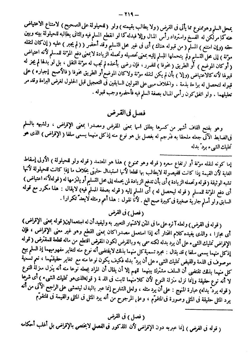 فَصْلٌ فِي الْقَرْضِ وَهُوَ بِفَتْحِ الْقَافِ أَشْهَرُ مِنْ كَسْرِهَا يُطْلَقُ اسْمًا بِمَعْنَى الْمُقْرَضِ وَمَصْدَرًا بِمَعْنَى الْإِقْرَاضِ، وَلِشَبَهِهِ بِالسَّلَمِ فِي الضَّابِطِ الْآتِي جَعَلَهُ مُلْحَقًا بِهِ فَتَرْجَمَ لَهُ بِفَصْلٍ بَلْ هُوَ نَوْعٌ مِنْهُ إذْ كُلٌّ مِنْهُمَا يُسَمَّى سَلَفًا (الْإِقْرَاضُ) الَّذِي هُوَ تَمْلِيكُ الشَّيْءِ بِرَدِّ بَدَلِهِ