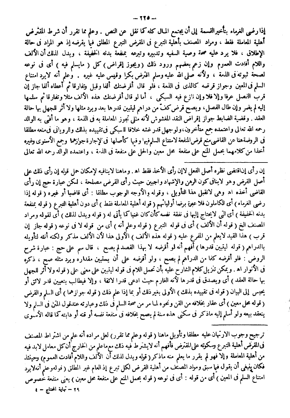 ـــــــــــــــــــــــــــــQتَرْجِيحُ وُجُوبِ الِارْتِهَانِ عَلَيْهِ مُطْلَقًا وَتَأْوِيلُ مَا هُنَا. (وَقَوْلُهُ: وَعُلِمَ مِمَّا تَقَرَّرَ) لَعَلَّ مُرَادَهُ أَنَّهُ عَلِمَ مِنْ اشْتِرَاطِ الْمُصَنِّفِ فِي الْمُقْرِضِ أَهْلِيَّةَ التَّبَرُّعِ وَسُكُوتَهُ عَلَى الْمُقْتَرِضِ فَأَفْهَمَ أَنَّهُ لَا يُشْتَرَطُ فِيهِ ذَلِكَ مَعَ مَا عُلِمَ مِنْ الْخَارِجِ أَنَّ كُلَّ مُعَامِلٍ لَا بُدَّ فِيهِ مِنْ أَهْلِيَّةِ الْمُعَامَلَةِ وَإِلَّا فَهُوَ لَمْ يُقَرِّرْ مَا يَعْلَمُ مِنْهُ مَا ذُكِرَ. (قَوْلُهُ: وَيَدُلُّ لِذَلِكَ أَنَّ الْأَلِفَ وَاللَّامَ أَفَادَتْ الْعُمُومَ) وَحِينَئِذٍ فَكَانَ يَنْبَغِي أَنْ يَقُولَ فِيمَا سَبَقَ وَمُرَادُ الْمُصَنِّفِ مِنْ أَهْلِيَّةِ الْمُقْرِضِ لِكُلِّ تَبَرُّعٍ إذْ الْعَامُّ غَيْرُ الْمُطْلَقِ