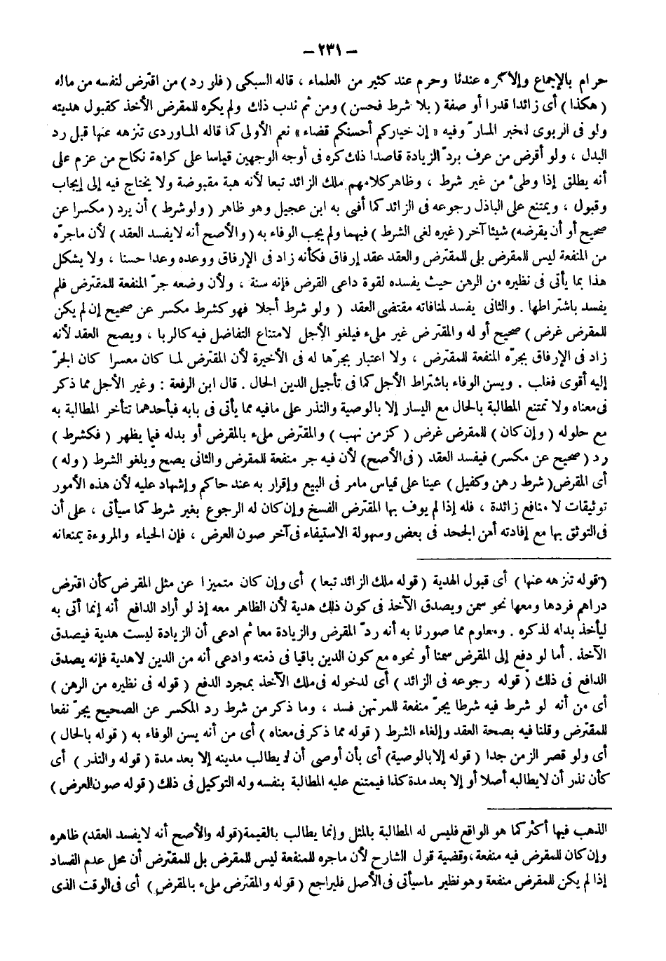 حَرَامٌ بِالْإِجْمَاعِ وَإِلَّا كُرِهَ عِنْدَنَا وَحَرُمَ عِنْدَ كَثِيرٍ مِنْ الْعُلَمَاءِ، قَالَهُ السُّبْكِيُّ (فَلَوْ رَدَّ) مَنْ اقْتَرَضَ لِنَفْسِهِ مِنْ مَالِهِ (هَكَذَا) أَيْ زَائِدًا قَدْرًا أَوْ صِفَةً (بِلَا شَرْطٍ فَحَسَنٌ) وَمِنْ ثَمَّ نُدِبَ ذَلِكَ وَلَمْ يُكْرَهْ لِلْمُقْرِضِ الْأَخْذُ كَقَبُولِ هَدِيَّتِهِ وَلَوْ فِي الرِّبَوِيِّ لِلْخَبَرِ الْمَارِّ وَفِيهِ «إنَّ خِيَارَكُمْ أَحْسَنُكُمْ قَضَاءً» نَعَمْ الْأَوْلَى كَمَا قَالَهُ الْمَاوَرْدِيُّ تَنَزُّهُهُ عَنْهَا قَبْلَ رَدِّ الْبَدَلِ، وَلَوْ أَقْرَضَ مَنْ عُرِفَ بِرَدِّ الزِّيَادَةِ قَاصِدًا ذَلِكَ كُرِهَ فِي أَوْجَهِ الْوَجْهَيْنِ قِيَاسًا عَلَى كَرَاهَةِ نِكَاحِ مَنْ عَزَمَ عَلَى أَنَّهُ يُطَلِّقُ إذَا وَطِئَ مِنْ غَيْرِ شَرْطٍ، وَظَاهِرُ كَلَامِهِمْ مِلْكُ الزَّائِدِ تَبَعًا لِأَنَّهُ هِبَةٌ مَقْبُوضَةٌ وَلَا يَحْتَاجُ فِيهِ إلَى إيجَابٍ وَقَبُولٍ، وَيَمْتَنِعُ عَلَى الْبَاذِلِ رُجُوعُهُ فِي الزَّائِدِ كَمَا أَفْتَى بِهِ ابْنُ عُجَيْلٍ وَهُوَ ظَاهِرٌ.