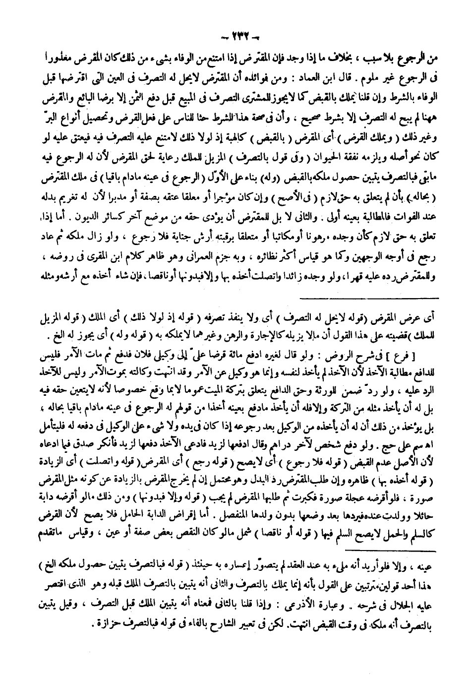قَالَ ابْنُ الْعِمَادِ: وَمِنْ فَوَائِدِهِ أَنَّ الْمُقْتَرِضَ لَا يَحِلُّ لَهُ التَّصَرُّفُ فِي الْعَيْنِ الَّتِي اقْتَرَضَهَا قَبْلَ الْوَفَاءِ بِالشَّرْطِ وَإِنْ قُلْنَا يَمْلِكُ بِالْقَبْضِ كَمَا لَا يَجُوزُ لِلْمُشْتَرِي التَّصَرُّفُ فِي الْمَبِيعِ قَبْلَ دَفْعِ الثَّمَنِ إلَّا بِرِضَا الْبَائِعِ وَالْمُقْرِضُ هَهُنَا لَمْ يَبِحْ لَهُ التَّصَرُّفَ إلَّا بِشَرْطٍ صَحِيحٍ، وَأَنَّ فِي صِحَّةِ هَذَا الشَّرْطِ حَثًّا لِلنَّاسِ عَلَى فِعْلِ الْقَرْضِ وَتَحْصِيلَ أَنْوَاعِ الْبِرِّ وَغَيْرِ ذَلِكَ.