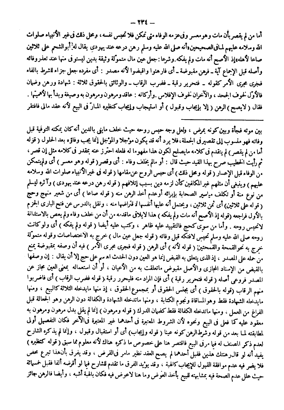 ـــــــــــــــــــــــــــــSبَيْنَ مَوْتِهِ فَجْأَةً وَبَيْنَ كَوْنِهِ بِمَرَضٍ، وَلَعَلَّ وَجْهَ حَبْسِ رُوحِهِ حَيْثُ خَلَّفَ مَا يَفِي بِالدَّيْنِ أَنَّهُ كَانَ يُمْكِنُهُ التَّوْفِيَةُ قَبْلَ وَفَاتِهِ فَهُوَ مَنْسُوبٌ إلَى تَقْصِيرٍ فِي الْجُمْلَةِ، فَلَا يَرِدُ أَنَّهُ قَدْ يَكُونُ مُؤَجَّلًا وَالْمُؤَجَّلُ إنَّمَا يَجِبُ وَفَاؤُهُ بَعْدَ الْحُلُولِ (قَوْلُهُ: أَمَّا مَنْ لَمْ يُقَصِّرْ) لَمْ يَتَقَدَّمْ فِي كَلَامِهِ مَا يَصْلُحُ لِكَوْنِ هَذَا مَفْهُومًا لَهُ فَلَعَلَّهُ احْتَرَزَ عَنْهُ بِمُقَدَّرٍ فِي كَلَامِهِ مِثْلِ إنْ قَصَّرَ، ثُمَّ رَأَيْت الْخَطِيبَ صَرَّحَ بِهَذَا الْقَيْدِ حَيْثُ قَالَ: أَوْ مَا لَمْ يَخْلُفْ وَفَاءً: أَيْ وَقَصَّرَ (قَوْلُهُ: وَهُوَ مُعْسِرٌ) أَيْ وَلَمْ يَتَمَكَّنْ مِنْ الْوَفَاءِ قَبْلَ الْإِعْسَارِ (قَوْلُهُ: وَمَحَلُّ ذَلِكَ) أَيْ حَبْسُ الرُّوحِ عَنْ مَقَامِهَا (قَوْلُهُ: فِي غَيْرِ الْأَنْبِيَاءِ صَلَوَاتُ اللَّهِ وَسَلَامُهُ عَلَيْهِمْ) وَيَنْبَغِي أَنَّ مِثْلَهُمْ غَيْرُ الْمُكَلَّفِينَ كَأَنْ لَزِمَهُ دَيْنٌ بِسَبَبِ إتْلَافِهِمْ (قَوْلُهُ: رَهَنَ دِرْعَهُ عِنْدَ يَهُودِيٍّ) وَآثَرَهُ لِيَسْلَمَ مِنْ نَوْعِ مِنَّةٍ أَوْ تَكَلُّفِ مَيَاسِيرِ الصَّحَابَةِ بِإِبْرَائِهِ أَوْ عَدَمِ أَخْذِ الرَّهْنِ مِنْهُ (قَوْلُهُ: صَاعًا) أَيْ مِنْ شَعِيرٍ مَنْهَجٌ وحج (قَوْلُهُ: عَلَى ثَلَاثِينَ) أَيْ ثَمَنُ ثَلَاثِينَ، وَيَحْتَمِلُ أَنَّهُ عَلَيْهَا أَنْفُسِهَا لِاقْتِرَاضِهَا مِنْهُ، وَنُقِلَ بِالدَّرْسِ عَنْ فَتْحِ الْبَارِي الْجَزْمُ بِالْأَوَّلِ فَرَاجِعْهُ (قَوْلُهُ إذْ الْأَصَحُّ أَنَّهُ مَاتَ وَلَمْ يَفُكَّهُ) هَذَا لَا يُلَاقِي مَا قَدَّمَهُ مِنْ أَنَّ مَنْ خَلَّفَ وَفَاءً وَلَمْ يَعْصِ بِالِاسْتِدَانَةِ لَا تُحْبَسُ رُوحُهُ.