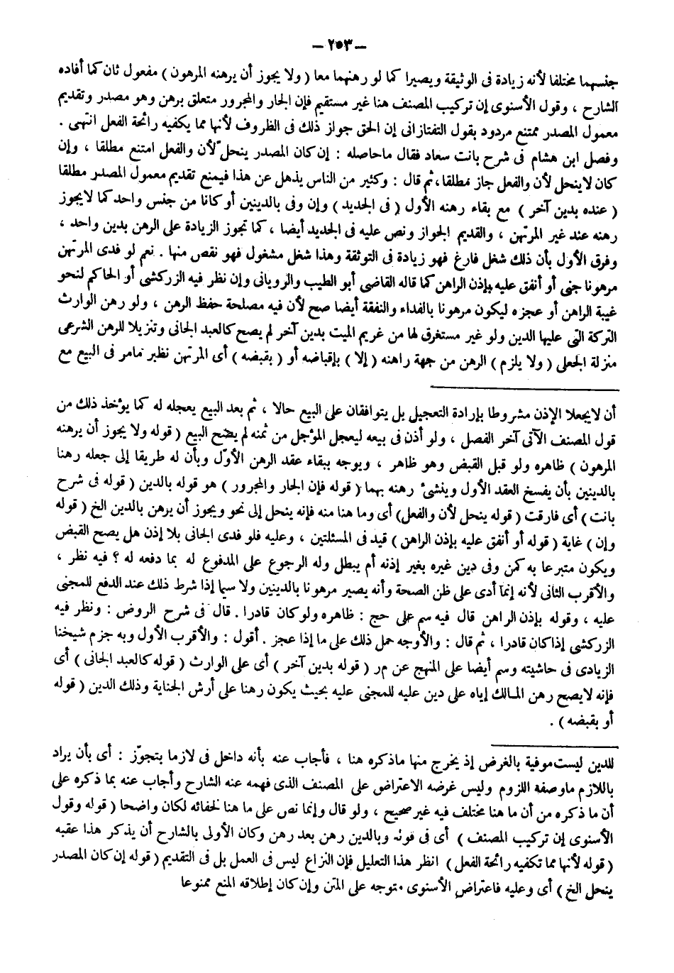 وَفَصَّلَ ابْنُ هِشَامٍ فِي شَرْحِ بَانَتْ سُعَادُ فَقَالَ مَا حَاصِلُهُ: إنْ كَانَ الْمَصْدَرُ يَنْحَلُّ لَأَنْ وَالْفِعْلِ امْتَنَعَ مُطْلَقًا، وَإِنْ كَانَ لَا يَنْحَلُّ لَأَنْ وَالْفِعْلِ جَازَ مُطْلَقًا، ثُمَّ قَالَ: وَكَثِيرٌ مِنْ النَّاسِ يَذْهَلُ عَنْ هَذَا فَيَمْنَعُ تَقْدِيمَ مَعْمُولِ الْمَصْدَرِ مُطْلَقًا (عِنْدَهُ بِدَيْنٍ آخَرَ) مَعَ بَقَاءِ رَهْنِهِ الْأَوَّلِ (فِي الْجَدِيدِ) وَإِنْ وَفَّى بِالدِّينَيْنِ أَوْ كَانَا مِنْ جِنْسٍ وَاحِدٍ كَمَا لَا يَجُوزُ رَهْنُهُ عِنْدَ غَيْرِ الْمُرْتَهِنِ، وَالْقَدِيمُ الْجَوَازُ وَنَصَّ عَلَيْهِ فِي الْجَدِيدِ أَيْضًا، كَمَا تَجُوزُ الزِّيَادَةُ عَلَى الرَّهْنِ بِدَيْنٍ وَاحِدٍ، وَفَرَّقَ الْأَوَّلُ بِأَنَّ ذَلِكَ شُغْلٌ فَارِغٌ فَهُوَ زِيَادَةٌ فِي التَّوْثِقَةِ وَهَذَا شُغْلٌ مَشْغُولٌ فَهُوَ نَقْصٌ مِنْهَا. نَعَمْ لَوْ فَدَى الْمُرْتَهِنُ مَرْهُونًا جَنَى أَوْ أَنْفَقَ عَلَيْهِ بِإِذْنِ الرَّاهِنِ كَمَا قَالَهُ الْقَاضِي أَبُو الطَّيِّبِ وَالرُّويَانِيُّ وَإِنْ نَظَرَ فِيهِ الزَّرْكَشِيُّ أَوْ الْحَاكِمُ لِنَحْوِ غَيْبَةِ الرَّاهِنِ أَوْ عَجْزِهِ لِيَكُونَ مَرْهُونًا بِالْفِدَاءِ وَالنَّفَقَةِ أَيْضًا صَحَّ لِأَنَّ فِيهِ مَصْلَحَةَ حِفْظِ الرَّهْنِ.