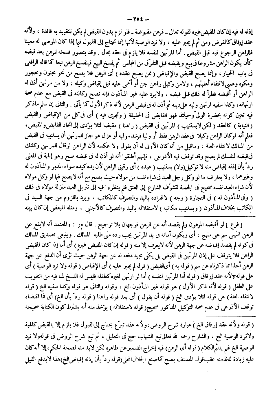 إذْنِهِ لَهُ فِيهِ إنْ كَانَ الْمُقْبَضُ غَيْرَهُ لِقَوْلِهِ تَعَالَى {فَرِهَانٌ مَقْبُوضَةٌ} [البقرة: 283] فَلَوْ لَزِمَ بِدُونِ الْقَبْضِ لَمْ يَكُنْ لِلتَّقْيِيدِ بِهِ فَائِدَةٌ، وَلِأَنَّهُ عَقْدُ إرْفَاقٍ كَالْقَرْضِ وَمِنْ ثَمَّ لَمْ يُجْبَرْ عَلَيْهِ، وَلَا تُرَدُّ الْوَصِيَّةُ لِأَنَّهَا إنَّمَا تَحْتَاجُ إلَى الْقَبُولِ فِيمَا إذَا كَانَ الْمُوصَى لَهُ مُعَيَّنًا فَلِلرَّاهِنِ الرُّجُوعُ فِيهِ قَبْلَ الْقَبْضِ. أَمَّا الْمُرْتَهِنُ لِنَفْسِهِ فَلَا يَلْزَمُ فِي حَقِّهِ بِحَالٍ. وَقَدْ يُتَصَوَّرُ فَسْخُهُ لِلرَّهْنِ بَعْدَ قَبْضِهِ كَأَنْ يَكُونَ الرَّاهِنُ مَشْرُوطًا فِي بَيْعٍ وَيَقْبِضَهُ قَبْلَ التَّفَرُّقِ مِنْ الْمَجْلِسِ ثُمَّ يُفْسَخَ الْبَيْعُ فَيَنْفَسِخَ الرَّهْنُ تَبَعًا كَمَا قَالَهُ الرَّافِعِيُّ فِي بَابِ الْخِيَارِ، وَإِنَّمَا يَصِحُّ الْقَبْضُ وَالْإِقْبَاضُ (مِمَّنْ يَصِحُّ عَقْدُهُ) أَيْ الرَّهْنُ فَلَا يَصِحُّ مِنْ نَحْوِ مَجْنُونٍ وَمَحْجُورٍ وَمُكْرَهٍ وَصَبِيٍّ لِانْتِفَاءِ أَهْلِيَّتِهِمْ، وَلَا مِنْ وَكِيلِ رَاهِنٍ جُنَّ أَوْ أُغْمِيَ عَلَيْهِ قَبْلَ إقْبَاضِ وَكِيلِهِ، وَلَا مِنْ مُرْتَهِنٍ أَذِنَ لَهُ الرَّاهِنُ أَوْ أَقْبَضَهُ فَطَرَأَ لَهُ ذَلِكَ قَبْلَ قَبْضِهِ، وَلَا يُرَدُّ عَلَيْهِ غَيْرُ الْمَأْذُونِ فَإِنَّهُ تَصِحُّ وَكَالَتُهُ فِي الْقَبْضِ مَعَ عَدَمِ صِحَّةِ ارْتِهَانِهِ، وَكَذَا سَفِيهٌ ارْتَهَنَ وَلِيَّهُ عَلَى دَيْنِهِ ثُمَّ أَذِنَ لَهُ فِي قَبْضِ الرَّهْنِ لِأَنَّهُ ذَكَرَ الْأَوَّلَ كَمَا يَأْتِي. وَالثَّانِي إنْ سَلَّمَ مَا ذَكَرَ فِيهِ تَعَيَّنَ كَوْنُهُ بِحَضْرَةِ الْوَلِيِّ وَحِينَئِذٍ فَهُوَ الْقَابِضُ فِي الْحَقِيقَةِ