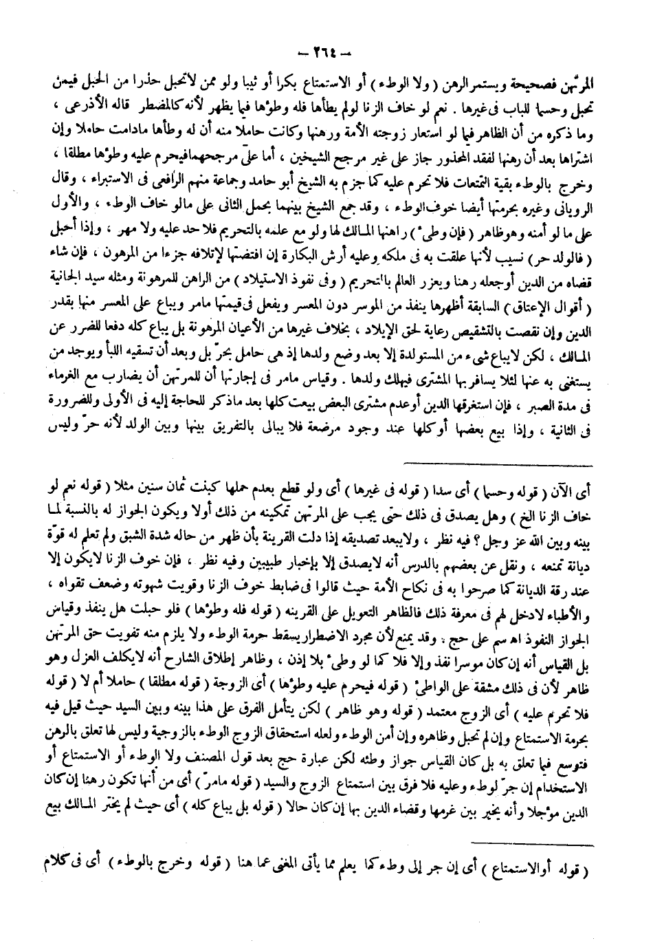 الْمُرْتَهِنِ فَصَحِيحَةٌ وَيَسْتَمِرُّ الرَّهْنُ (وَلَا الْوَطْءُ) أَوْ الِاسْتِمْتَاعُ بِكْرًا أَوْ ثَيِّبًا وَلَوْ مِمَّنْ لَا تَحْبَلُ حَذَرًا مِنْ الْحَبَلِ فِيمَنْ تَحْبَلُ وَحَسْمًا لِلْبَابِ فِي غَيْرِهَا. نَعَمْ لَوْ خَافَ الزِّنَا لَوْ لَمْ يَطَأْهَا فَلَهُ وَطْؤُهَا فِيمَا يَظْهَرُ لِأَنَّهُ كَالْمُضْطَرِّ قَالَهُ الْأَذْرَعِيُّ، وَمَا ذَكَرَهُ مِنْ أَنَّ الظَّاهِرَ فِيمَا لَوْ اسْتَعَارَ زَوْجَتَهُ الْأَمَةَ وَرَهَنَهَا وَكَانَتْ حَامِلًا مِنْهُ أَنَّ لَهُ وَطْأَهَا مَا دَامَتْ حَامِلًا وَإِنْ اشْتَرَاهَا بَعْدَ أَنْ رَهَنَهَا لِفَقْدِ الْمَحْذُورِ جَازَ عَلَى غَيْرِ مُرَجَّحِ الشَّيْخَيْنِ، أَمَّا عَلَى مُرَجَّحِهِمَا فَيَحْرُمُ عَلَيْهِ وَطْؤُهَا مُطْلَقًا، وَخَرَجَ بِالْوَطْءِ بَقِيَّةُ التَّمَتُّعَاتِ فَلَا تَحْرُمُ عَلَيْهِ كَمَا جَزَمَ بِهِ الشَّيْخُ أَبُو حَامِدٍ وَجَمَاعَةٌ مِنْهُمْ الرَّافِعِيُّ فِي الِاسْتِبْرَاءِ، وَقَالَ الرُّويَانِيُّ وَغَيْرُهُ بِحُرْمَتِهَا أَيْضًا خَوْفَ الْوَطْءِ، وَقَدْ جَمَعَ الشَّيْخُ بَيْنَهُمَا بِحَمْلِ الثَّانِي عَلَى مَا لَوْ خَافَ الْوَطْءَ، وَالْأَوَّلِ عَلَى مَا لَوْ أَمِنَهُ وَهُوَ ظَاهِرٌ.
