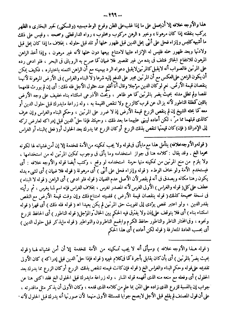 ـــــــــــــــــــــــــــــSقَوْلُهُ: وَالْأَوْجَهُ خِلَافُهُ) يُتَأَمَّلُ هَذَا مَعَ مَا يَأْتِي فِي قَوْلِهِ وَلَا يَجِبُ تَمْكِينُهُ مِنْ الْأَمَةِ لِلْخِدْمَةِ إلَّا إنْ أَمِنَ غَشَيَانَهُ لَهَا لِكَوْنِهِ مُحْرِمًا إلَخْ، وَقَدْ يُقَالُ: كَلَامُهُ هُنَا فِي جَوَازِ اسْتِخْدَامِهِ وَمَا يَأْتِي فِي وُجُوبِ تَمْكِينِ الْمُرْتَهِنِ لَهُ مِنْ اسْتِخْدَامِهَا، وَلَا يَلْزَمُ مِنْ مَنْعِ الْمُرْتَهِنِ مِنْ تَمْكِينِهِ مِنْهَا حُرْمَةُ اسْتِخْدَامِهِ لَوْ وَقَعَ، وَكَتَبَ أَيْضًا قَوْلَهُ وَالْأَوْجَهُ خِلَافُهُ: أَيْ فَيَسْتَخْدِمُ الْأَمَةَ وَلَوْ خَافَ الْوَطْءَ (قَوْلُهُ: وَإِنْزَاءِ فَحْلٍ عَلَى أُنْثَى) أَيْ مَرْهُونَةٍ (قَوْلُهُ فَلَا ضَمَانَ) أَيْ لِشَيْءٍ بَدَّلَهُ يَكُونُ رَهْنًا مَكَانَهُ وَيَصْدُقُ فِي أَنَّهُ لَمْ يُقَصِّرْ لِأَنَّ الْأَصْلَ عَدَمُ الضَّمَانِ (قَوْلُهُ: فَلَوْ ادَّعَى) أَيْ الرَّاهِنُ (قَوْلُهُ: لَا الْبِنَاءُ) عَطْفٌ عَلَى كُلُّ (قَوْلُهُ: وَالْغِرَاسُ) الْأَوْلَى الْغَرْسُ لِأَنَّهُ الْمَصْدَرُ لِغَرَسَ، بِخِلَافِ الْغِرَاسِ فَإِنَّهُ اسْمٌ لِمَا يُغْرَسُ، ثُمَّ رَأَيْته فِي نُسْخَةٍ صَحِيحَةٍ كَذَلِكَ (قَوْلُهُ: يُنْقِصَانِ قِيمَةَ الْأَرْضِ) قَضِيَّتُهُ امْتِنَاعُ ذَلِكَ وَإِنْ وَفَّتْ قِيمَةُ الْأَرْضِ مَعَ النَّقْصِ بِقَدْرِ الدَّيْنِ، وَلَوْ اُعْتُبِرَ نَقْصٌ يُؤَدِّي إلَى تَفْوِيتِ حَقِّ الْمُرْتَهِنِ لَمْ يَكُنْ بَعِيدًا اهـ (قَوْلُهُ فَلَهُ ذَلِكَ) أَيْ قَهْرًا (قَوْلُهُ: اسْتِثْنَاءُ بِنَاءٍ) أَيْ فَلَا يَتَوَقَّفُ عَلَى إذْنٍ وَلَا يَفْتَرِقُ فِيهِ الْحُكْمُ بَيْنَ الْحَالِّ وَالْمُؤَجَّلِ (قَوْلُهُ: النَّاطُورُ) أَيْ الْحَافِظُ لِلزَّرْعِ وَنَحْوُهُ، وَفِي الْمُخْتَارِ النَّاطِرُ وَالنَّاطُورُ حَافِظُ الْكَرْمِ وَالْجَمْعُ النَّاطِرُونَ وَالنَّوَاطِيرُ (قَوْلُهُ: مَا يُذْكَرُ قَبْلَ حُلُولِ الدَّيْنِ) أَيْ بِحَسَبِ الْعَادَةِ الْمُتَعَارَفَةِ (قَوْلُهُ لَكِنْ أَعَادَهُ) أَيْ هَذَا الْحُكْمَ.