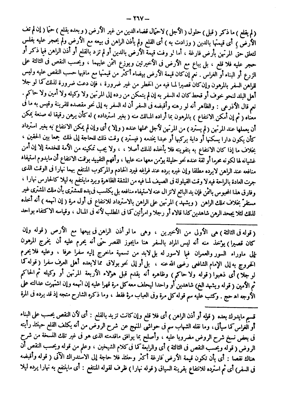 أَمَّا لَوْ وَفَّتْ قِيمَةُ الْأَرْضِ بِالدَّيْنِ أَوْ لَمْ تَزِدْ بِالْقَلْعِ أَوْ أَذِنَ الرَّاهِنُ فِيمَا ذُكِرَ أَوْ حُجِرَ عَلَيْهِ فَلَا قَلْعَ، بَلْ يُبَاعُ مَعَ الْأَرْضِ فِي الْأَخِيرَتَيْنِ وَيُوَزَّعُ الثَّمَنُ عَلَيْهِمَا، وَيُحْسَبُ النَّقْصُ فِي الثَّالِثَةِ عَلَى الزَّرْعِ أَوْ الْبِنَاءِ أَوْ الْغِرَاسِ، نَعَمْ إنْ كَانَ قِيمَةُ الْأَرْضِ بَيْضَاءَ أَكْثَرَ مِنْ قِيمَتِهَا مَعَ مَا فِيهَا حُسِبَ النَّقْصُ عَلَيْهِ وَلَيْسَ لِلرَّاهِنِ السَّفَرُ بِالْمَرْهُونِ وَإِنْ كَانَ قَصِيرًا لِمَا فِيهِ مِنْ الْخَطَرِ مِنْ غَيْرِ ضَرُورَةٍ، فَإِنْ دَعَتْ ضَرُورَةٌ لِذَلِكَ كَمَا لَوْ جَلَا أَهْلُ الْبَلَدِ لِنَحْوِ خَوْفٍ أَوْ قَحْطٍ كَانَ لَهُ السَّفَرُ بِهِ إنْ لَمْ يَتَمَكَّنْ مِنْ رَدِّهِ إلَى الْمُرْتَهِنِ وَلَا وَكِيلِهِ وَلَا أَمِينٍ وَلَا حَاكِمٍ. نَعَمْ قَالَ الْأَذْرَعِيُّ: وَالظَّاهِرُ أَنَّهُ لَوْ رَهَنَهُ وَأَقْبَضَهُ فِي السَّفَرِ أَنَّ لَهُ السَّفَرَ بِهِ إلَى نَحْوِ مَقْصِدِهِ لِلْقَرِينَةِ وَقِيسَ بِهِ مَا فِي مَعْنَاهُ (ثُمَّ) (أَمْكَنَ الِانْتِفَاعُ) بِالْمَرْهُونِ بِمَا أَرَادَهُ الْمَالِكُ مِنْهُ (بِغَيْرِ اسْتِرْدَادِهِ) لَهُ كَأَنْ يَرْهَنَ رَقِيقًا لَهُ صَنْعَةٌ يُمْكِنُ أَنْ يَعْمَلَهَا عِنْدَ الْمُرْتَهِنِ (لَمْ يَسْتَرِدَّ) مِنْ الْمُرْتَهِنِ لِأَجْلِ عَمَلِهَا عِنْدَهُ (وَإِلَّا) أَيْ وَإِنْ لَمْ يُمْكِنْ الِانْتِفَاعُ بِهِ بِغَيْرِ اسْتِرْدَادٍ كَأَنْ يَكُونَ دَارًا يَسْكُنُهَا أَوْ دَابَّةً يَرْكَبُهَا أَوْ عَبْدًا يَخْدُمُهُ (فَيُسْتَرَدُّ) وَقْتَ ذَلِكَ لِلْحَاجَةِ إلَى ذَلِكَ جَمْعًا بَيْنَ الْحَقَّيْنِ.