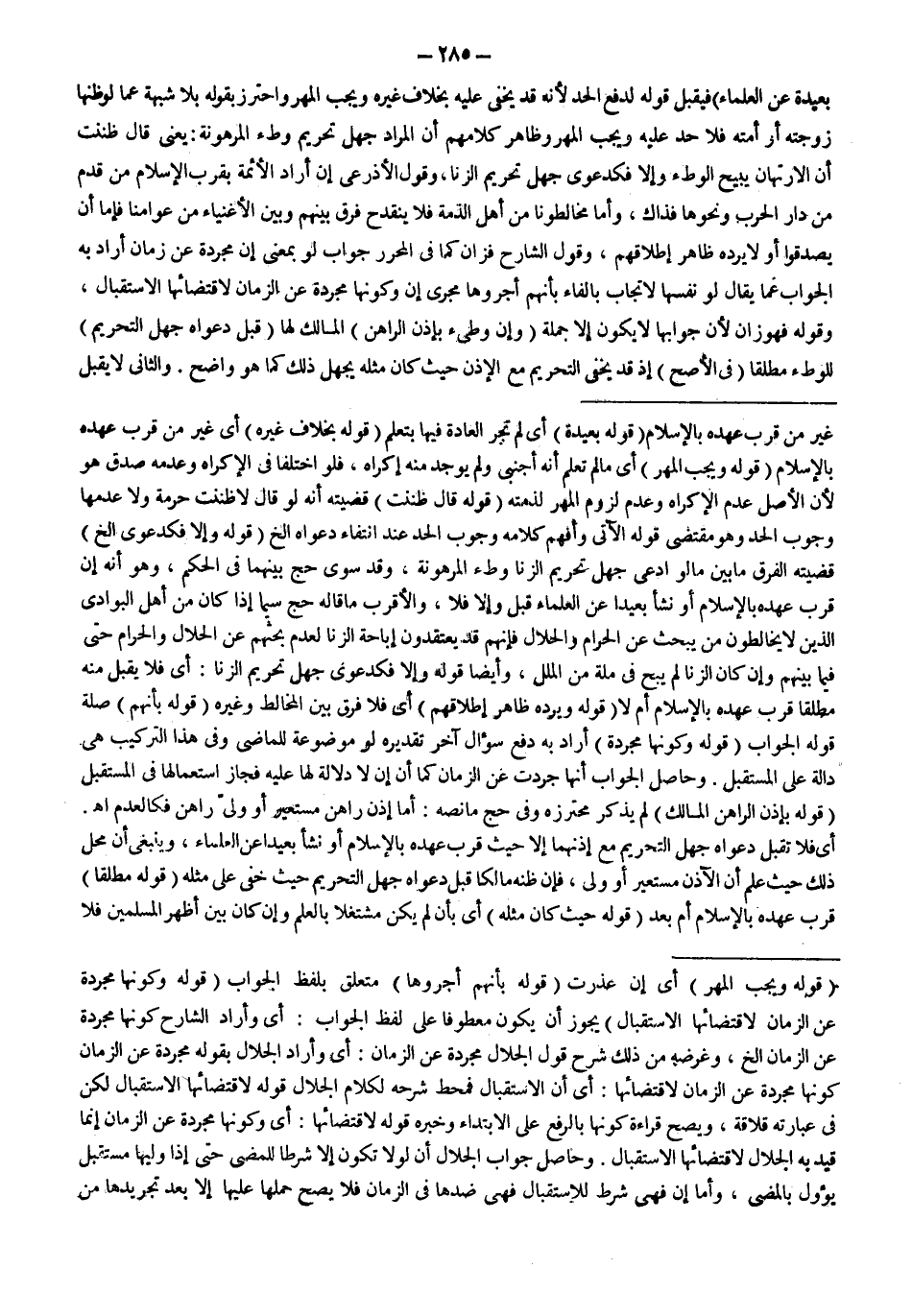 بَعِيدَةٍ عَنْ الْعُلَمَاءِ) فَيُقْبَلُ قَوْلُهُ لِدَفْعِ الْحَدِّ لِأَنَّهُ قَدْ يَخْفَى عَلَيْهِ بِخِلَافِ غَيْرِهِ وَيَجِبُ الْمَهْرُ وَاحْتُرِزَ بِقَوْلِهِ بِلَا شُبْهَةٍ عَمَّا لَوْ ظَنَّهَا زَوْجَتَهُ أَوْ أَمَتَهُ فَلَا حَدَّ عَلَيْهِ وَيَجِبُ الْمَهْرُ وَظَاهِرُ كَلَامِهِمْ أَنَّ الْمُرَادَ جَهْلُ تَحْرِيمِ وَطْءِ الْمَرْهُونَةِ: يَعْنِي قَالَ: ظَنَنْت أَنَّ الِارْتِهَانَ يُبِيحُ الْوَطْءَ وَإِلَّا فَكَدَعْوَى جَهْلِ تَحْرِيمِ الزِّنَا، وَقَوْلُ الْأَذْرَعِيِّ إنْ أَرَادَ الْأَئِمَّةُ بِقُرْبِ الْإِسْلَامِ مَنْ قَدِمَ مِنْ دَارِ الْحَرْبِ وَنَحْوِهَا فَذَاكَ، وَأَمَّا مُخَالِطُونَا مِنْ أَهْلِ الذِّمَّةِ فَلَا يَنْقَدِحُ فَرْقٌ بَيْنَهُمْ وَبَيْنَ الْأَغْنِيَاءِ مِنْ عَوَامِّنَا فَإِمَّا أَنْ يُصَدَّقُوا أَوْ لَا يَرُدُّهُ ظَاهِرُ إطْلَاقِهِمْ، وَقَوْلُ الشَّارِحِ فَزَانٍ كَمَا فِي الْمُحَرَّرِ جَوَابُ لَوْ بِمَعْنَى إنْ مُجَرَّدَةً عَنْ زَمَانٍ أَرَادَ بِهِ الْجَوَابَ عَمَّا يُقَالُ لَوْ نَفْسُهَا لَا تُجَابُ بِالْفَاءِ بِأَنَّهُمْ أَجْرَوْهَا مَجْرَى إنْ وَكَوْنُهَا مُجَرَّدَةً عَنْ الزَّمَانِ لِاقْتِضَائِهَا الِاسْتِقْبَالَ