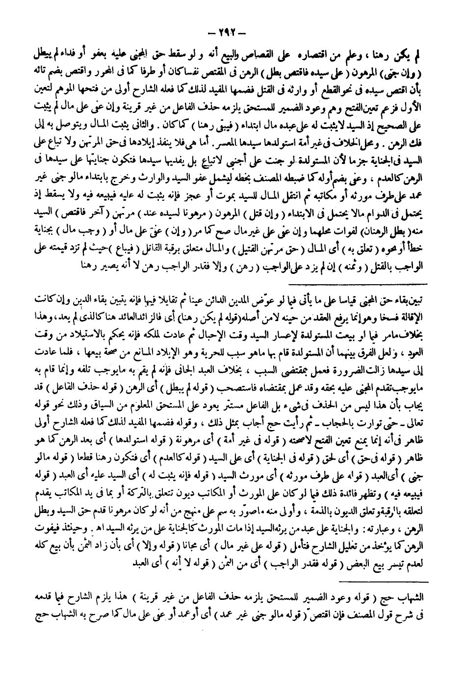 (قَوْلُهُ: وَعَوْدُ الضَّمِيرِ لِلْمُسْتَحِقِّ يَلْزَمُهُ حَذْفُ الْفَاعِلِ مِنْ غَيْرِ قَرِينَةٍ) هَذَا يَلْزَمُ الشَّارِحَ فِيمَا قَدَّمَهُ فِي شَرْحِ قَوْلِ الْمُصَنِّفِ فَإِنْ اُقْتُصَّ (قَوْلُهُ: مَا لَوْ جَنَى غَيْرَ عَمْدٍ) أَيْ: أَوْ عَمْدٍ أَوْ عُفِيَ عَلَى مَالٍ كَمَا صَرَّحَ بِهِ الشِّهَابُ حَجّ