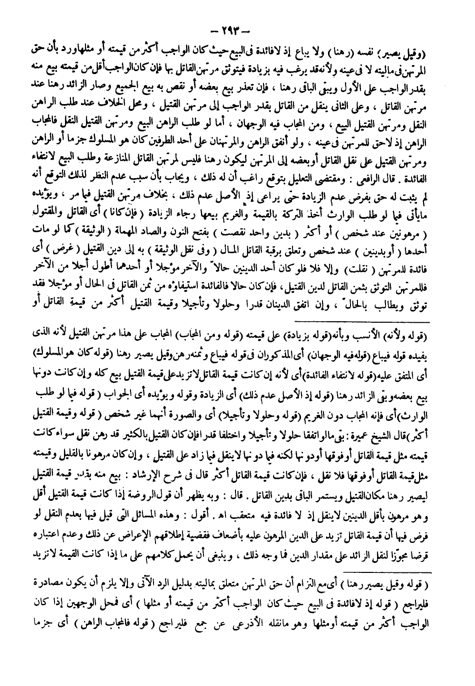 ـــــــــــــــــــــــــــــQقَوْلُهُ: وَقِيلَ يَصِيرُ رَهْنًا) أَيْ: مَعَ الْتِزَامِ أَنَّ حَقَّ الْمُرْتَهِنِ مُتَعَلِّقٌ بِمَالِيَّتِهِ بِدَلِيلِ الرَّدِّ الْآتِي وَإِلَّا يَلْزَمْ أَنْ يَكُونَ مُصَادَرَةً فَلْيُرَاجَعْ. (قَوْلُهُ: إذْ لَا فَائِدَةَ فِي الْبَيْعِ حَيْثُ كَانَ الْوَاجِبُ أَكْثَرَ مِنْ قِيمَتِهِ أَوْ مِثْلَهَا) أَيْ: فَمَحَلُّ الْوَجْهَيْنِ إذَا كَانَ الْوَاجِبُ أَكْثَرَ مِنْ قِيمَتِهِ أَوْ مِثْلَهَا وَهُوَ مَا نَقَلَهُ الْأَذْرَعِيُّ عَنْ جَمْعٍ فَلْيُرَاجَعْ. (قَوْلُهُ: فَالْمُجَابُ الرَّاهِنُ) أَيْ: جَزْمًا