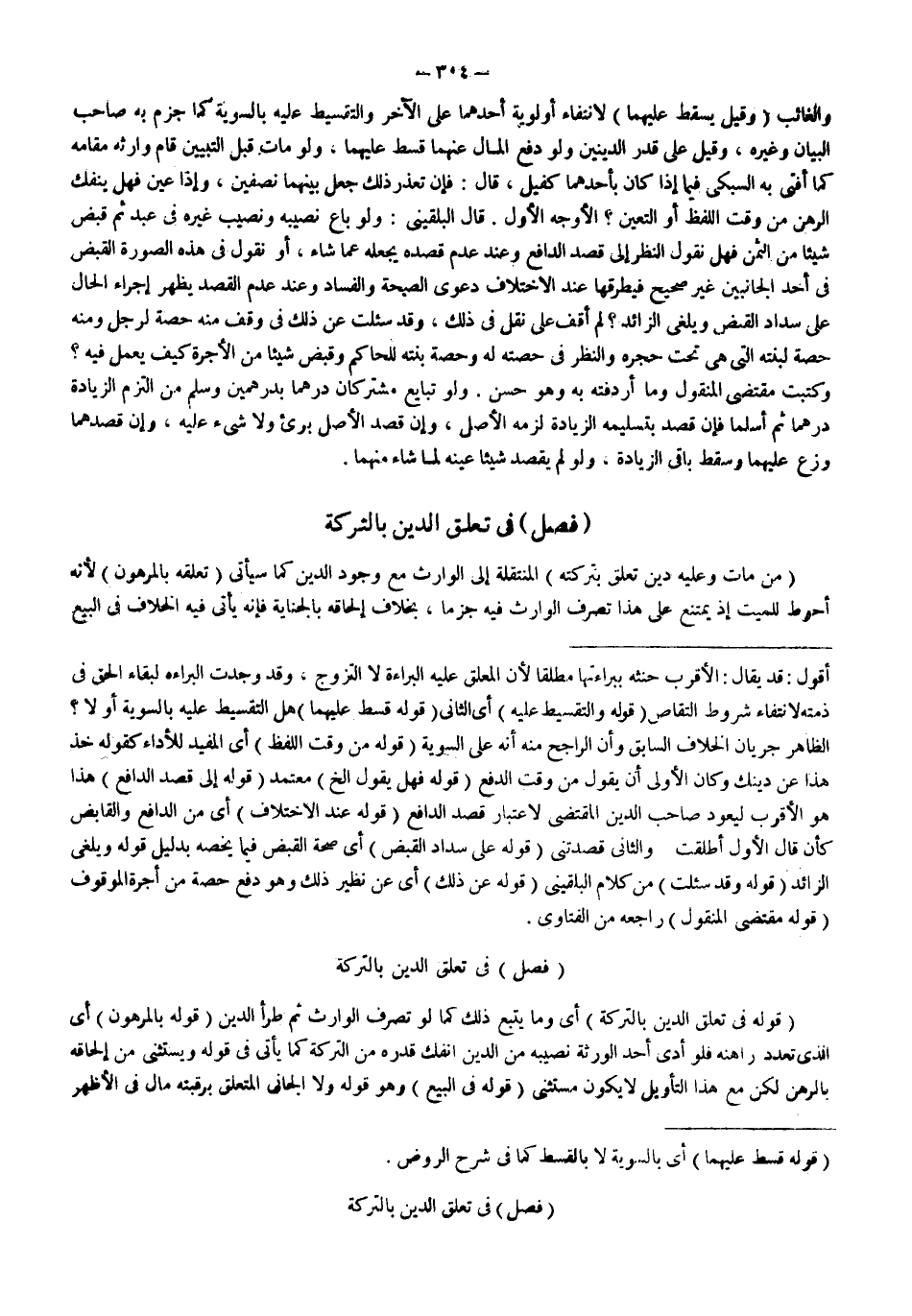 فَصْلٌ فِي تَعَلُّقِ الدَّيْنِ بِالتَّرِكَةِ (مَنْ مَاتَ وَعَلَيْهِ دَيْنٌ تَعَلَّقَ بِتَرِكَتِهِ) الْمُنْتَقِلَةِ إلَى الْوَارِثِ مَعَ وُجُودِ الدَّيْنِ كَمَا سَيَأْتِي (تَعَلُّقُهُ بِالْمَرْهُونِ) لِأَنَّهُ أَحْوَطُ لِلْمَيِّتِ إذْ يَمْتَنِعُ عَلَى هَذَا تَصَرُّفُ الْوَارِثِ فِيهِ جَزْمًا، بِخِلَافِ إلْحَاقِهِ بِالْجِنَايَةِ فَإِنَّهُ يَأْتِي فِيهِ الْخِلَافُ فِي الْبَيْعِ