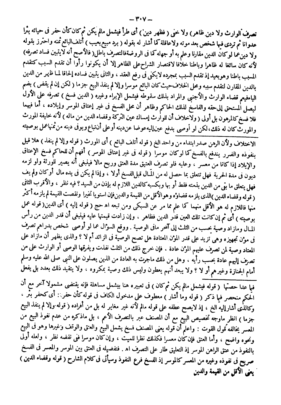 . (قَوْلُهُ: فَيَشْمَلُ مَا لَمْ يَكُنْ ثَمَّ كَانَ) فِي تَعْبِيرِهِ هُنَا بِيَشْمَلُ مُسَاهَلَةٌ فَإِنَّهُ يَقْتَضِي مَشْمُولًا آخَرَ مَعَ أَنَّ الْحُكْمَ مُنْحَصِرٌ فِيمَا ذُكِرَ. (قَوْلُهُ: وَمَا أَشَارَ) مَعْطُوفٌ عَلَى مَدْخُولِ الْكَافِ فِي قَوْلِهِ كَأَنْ حَفَرَ: أَيْ كَحَفْرِ بِئْرٍ، وَكَاَلَّذِي أَشَارَ إلَيْهِ إلَخْ؛ إذْ لَا يَصِحُّ عَطْفُهُ عَلَى قَوْلِهِ مَا لَمْ؛ لِأَنَّهُ غَيْرُ مُغَايِرٍ لَهُ بَلْ مِنْ أَفْرَادِهِ. (قَوْلُهُ: وَإِلَّا لَمْ يَنْفُذْ الْبَيْعُ جَزْمًا) اُنْظُرْ مَا وَجْهُ تَخْصِيصِ الْبَيْعِ مَعَ أَنَّ الْمُصَنِّفَ عَبَّرَ بِالتَّصَرُّفِ الْأَعَمِّ، بَلْ مَا ذَكَرَهُ مِنْ عَدَمِ نُفُوذِ الْبَيْعِ مِنْ الْمُعْسِرِ يُخَالِفُهُ قَوْلُ الْقُوتِ: وَاعْلَمْ أَنَّ قَوْلَهُ يَعْنِي الْمُصَنِّفَ فَسْخٌ يَشْمَلُ الْبَيْعَ وَالْعِتْقَ وَالْوَقْفَ وَغَيْرَهَا وَهُوَ فِي الْبَيْعِ وَنَحْوِهِ وَاضِحٌ، وَأَمَّا الْعِتْقُ فَإِنْ كَانَ مُعْسِرًا فَكَذَلِكَ نَظَرًا لِلْمَيِّتِ، وَإِنْ كَانَ مُوسِرًا فَفِي نَقْضِهِ نَظَرٌ، وَلَعَلَّهُ أَوْلَى بِالنُّفُوذِ مِنْ عِتْقِ الرَّاهِنِ الْمُوسِرِ إذْ التَّعْلِيقُ طَارٍ عَلَى التَّصَرُّفِ اهـ. فَتَفْضِيلُهُ فِي الْعِتْقِ بَيْنَ الْمُوسِرِ وَالْمُعْسِرِ فِي الْفَسْخِ صَرِيحٌ فِي نُفُوذِهِ وَغَيْرِهِ مِنْ الْمُعْسِرِ كَالْمُوسِرِ إذْ الْفَسْخُ فَرْعُ النُّفُوذِ وَسَيَأْتِي فِي كَلَامِ الشَّارِحِ