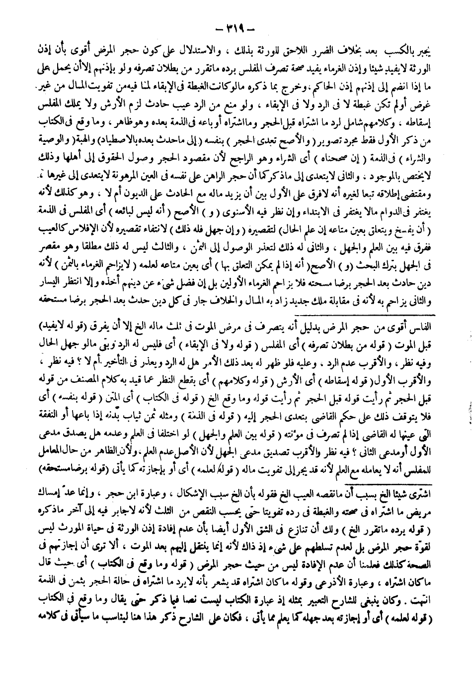 ـــــــــــــــــــــــــــــSالْفَلَسِ أَقْوَى مِنْ حَجْرِ الْمَرَضِ بِدَلِيلِ أَنَّهُ يَتَصَرَّفُ فِي مَرَضِ الْمَوْتِ فِي ثُلُثِ مَالِهِ إلَخْ إلَّا أَنْ يُفَرِّقَ (قَوْلُهُ: لَا يُفِيدُ) قَبْلَ الْمَوْتِ (قَوْلُهُ: مِنْ بُطْلَانِ تَصَرُّفِهِ) أَيْ الْمُفْلِسِ (قَوْلُهُ: وَلَا فِي الْإِبْقَاءِ) أَيْ فَلَيْسَ لَهُ الرَّدُّ وَبَقِيَ مَا لَوْ جَهِلَ الْحَالَ وَفِيهِ نَظَرٌ، وَالْأَقْرَبُ عَدَمُ الرَّدِّ، وَعَلَيْهِ فَلَوْ ظَهَرَ لَهُ بَعْدَ ذَلِكَ الْأَمْرُ هَلْ لَهُ الرَّدُّ وَيُعْذَرُ فِي التَّأْخِيرِ أَمْ لَا؟ فِيهِ نَظَرٌ، وَالْأَقْرَبُ الْأَوَّلُ (قَوْلُهُ: إسْقَاطُهُ) أَيْ الْأَرْشِ (قَوْلُهُ: وَكَلَامُهُمْ) أَيْ بِقَطْعِ النَّظَرِ عَمَّا قُيِّدَ بِهِ كَلَامُ الْمُصَنِّفِ مِنْ قَوْلِهِ قَبْلَ الْحَجْرِ ثُمَّ رَأَيْت قَوْلَهُ قَبْلَ الْحَجْرِ ثُمَّ رَأَيْت قَوْلَهُ وَمَا وَقَعَ إلَخْ (قَوْلُهُ: فِي الْكِتَابِ) أَيْ الْمَتْنِ.