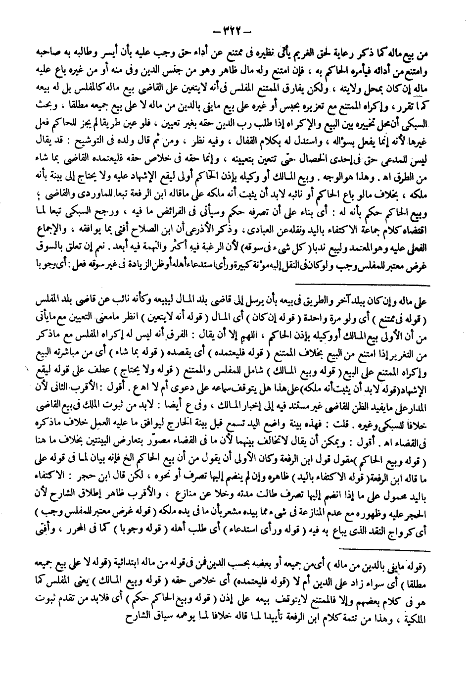 ـــــــــــــــــــــــــــــSعَلَى مَالِهِ وَإِنْ كَانَ بِبَلَدٍ آخَرَ وَالطَّرِيقُ فِي بَيْعِهِ بِأَنْ يُرْسِلَ إلَى قَاضِي بَلَدِ الْمَالِ لِيَبِيعَهُ وَكَأَنَّهُ نَائِبٌ عَنْ قَاضِي بَلَدِ الْمُفْلِسِ (قَوْلُهُ: فِي مُمْتَنِعٍ) أَيْ وَلَوْ مَرَّةً وَاحِدَةً (قَوْلُهُ: إنْ كَانَ) أَيْ الْمَالُ (قَوْلُهُ: إنَّهُ لَا يَتَعَيَّنُ) اُنْظُرْ مَا مَعْنَى التَّعْيِينِ مَعَ مَا يَأْتِي مِنْ أَنَّ الْأَوْلَى بَيْعُ الْمَالِكِ أَوْ وَكِيلِهِ بِإِذْنِ الْحَاكِمِ، اللَّهُمَّ إلَّا أَنْ يُقَالَ: الْفَرْقُ أَنَّهُ لَيْسَ لَهُ إكْرَاهُ الْمُفْلِسِ مَعَ مَا ذُكِرَ مِنْ التَّغْرِيرِ إذَا امْتَنَعَ مِنْ الْبَيْعِ بِخِلَافِ الْمُمْتَنِعِ (قَوْلُهُ: فَلْيَعْتَمِدْهُ) أَيْ يَقْصِدْهُ (قَوْلُهُ بِمَا شَاءَ) أَيْ مِنْ مُبَاشَرَتِهِ الْبَيْعَ وَإِكْرَاهِ الْمُمْتَنِعِ عَلَى الْبَيْعِ (قَوْلُهُ: وَبَيْعُ الْمَالِكِ) شَامِلٌ لِلْمُفْلِسِ وَالْمُمْتَنِعِ (قَوْلُهُ: وَلَا يَحْتَاجَ) عَطْفٌ عَلَى قَوْلِهِ لِيَقَعَ الْإِشْهَادُ (قَوْلُهُ: لَا بُدَّ أَنْ يَثْبُتَ أَنَّهُ مِلْكُهُ) عَلَى هَذَا هَلْ يَتَوَقَّفُ سَمَاعُهُ عَلَى دَعْوَى أَمْ لَا اهـ. ع. أَقُولُ: الْأَقْرَبُ الثَّانِي لِأَنَّ الْمَدَارَ عَلَى مَا يُفِيدُ الظَّنَّ لِلْقَاضِي غَيْرَ مُسْتَنِدٍ فِيهِ إلَى إخْبَارِ الْمَالِكِ، وَفِي ع أَيْضًا: لَا بُدَّ مِنْ ثُبُوتِ الْمِلْكِ فِي بَيْعِ الْقَاضِي خِلَافًا لِلسُّبْكِيِّ وَغَيْرِهِ. قُلْتُ: فَهَذِهِ بَيِّنَةُ وَاضِعِ الْيَدِ تُسْمَعُ قَبْلَ بَيِّنَةِ الْخَارِجِ لِيُوَافِقَ مَا عَلَيْهِ الْعَمَلُ خِلَافُ مَا ذَكَرَهُ فِي الْقَضَاءِ اهـ. أَقُولُ: وَيُمْكِنُ أَنْ يُقَالَ لَا تَخَالُفَ بَيْنَهُمَا لِأَنَّ مَا فِي الْقَضَاءِ مُصَوَّرٌ بِتَعَارُضِ الْبَيِّنَتَيْنِ بِخِلَافِ مَا هُنَا (قَوْلُهُ: وَبَيْعُ الْحَاكِمِ) مَقُولُ قَوْلِ ابْنِ الرِّفْعَةِ وَكَانَ الْأَوْلَى أَنْ يَقُولَ مِنْ أَنَّ بَيْعَ الْحَاكِمِ إلَخْ فَإِنَّهُ بَيَانٌ لِمَا فِي قَوْلِهِ عَلَى مَا قَالَهُ ابْنُ الرِّفْعَةِ (قَوْلُهُ: الِاكْتِفَاءَ بِالْيَدِ) ظَاهِرُهُ وَإِنْ لَمْ يَنْضَمَّ إلَيْهَا تَصَرُّفٌ أَوْ نَحْوُهُ، لَكِنْ قَالَ ابْنُ حَجَرٍ: الِاكْتِفَاءُ بِالْيَدِ مَحْمُولٌ عَلَى مَا إذَا انْضَمَّ إلَيْهَا تَصَرُّفٌ طَالَتْ مُدَّتُهُ وَخَلَا عَنْ مُنَازِعٍ، وَالْأَقْرَبُ ظَاهِرُ إطْلَاقِ الشَّارِحِ لِأَنَّ الْحَجْرَ عَلَيْهِ وَظُهُورَهُ مَعَ عَدَمِ الْمُنَازَعَةِ فِي شَيْءٍ مِمَّا بِيَدِهِ مُشْعِرٌ بِأَنَّ مَا فِي يَدِهِ مِلْكُهُ (قَوْلُهُ: غَرَضٌ مُعْتَبَرٌ لِلْمُفْلِسِ وَجَبَ) أَيْ كَرَوَاجِ النَّقْد الَّذِي يُبَاعُ بِهِ فِيهِ (قَوْلُهُ: وَرَأَى اسْتِدْعَاءَ) أَيْ طَلَبَ أَهْلِهِ (قَوْلُهُ: وُجُوبًا) كَمَا فِي الْمُحَرَّرِ، وَأَفْتَى