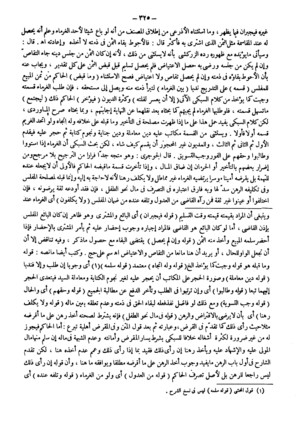 غَيْرِهِ فَيُجْبَرَانِ فِيمَا يَظْهَرُ، وَمَا اسْتَثْنَاهُ الْأَذْرَعِيُّ مِنْ إطْلَاقِ الْمُصَنِّفِ مِنْ أَنَّهُ لَوْ بَاعَ شَيْئًا لِأَحَدِ الْغُرَمَاءِ وَعَلِمَ أَنَّهُ يَحْصُلُ لَهُ عِنْدَ الْمُقَاسَمَةِ مِثْلُ الثَّمَنِ الَّذِي اشْتَرَى بِهِ فَأَكْثَرَ قَالَ: فَالْأَحْوَطُ بَقَاءُ الثَّمَنِ فِي ذِمَّتِهِ لَا أَخْذُهُ وَإِعَادَتُهُ اهـ.