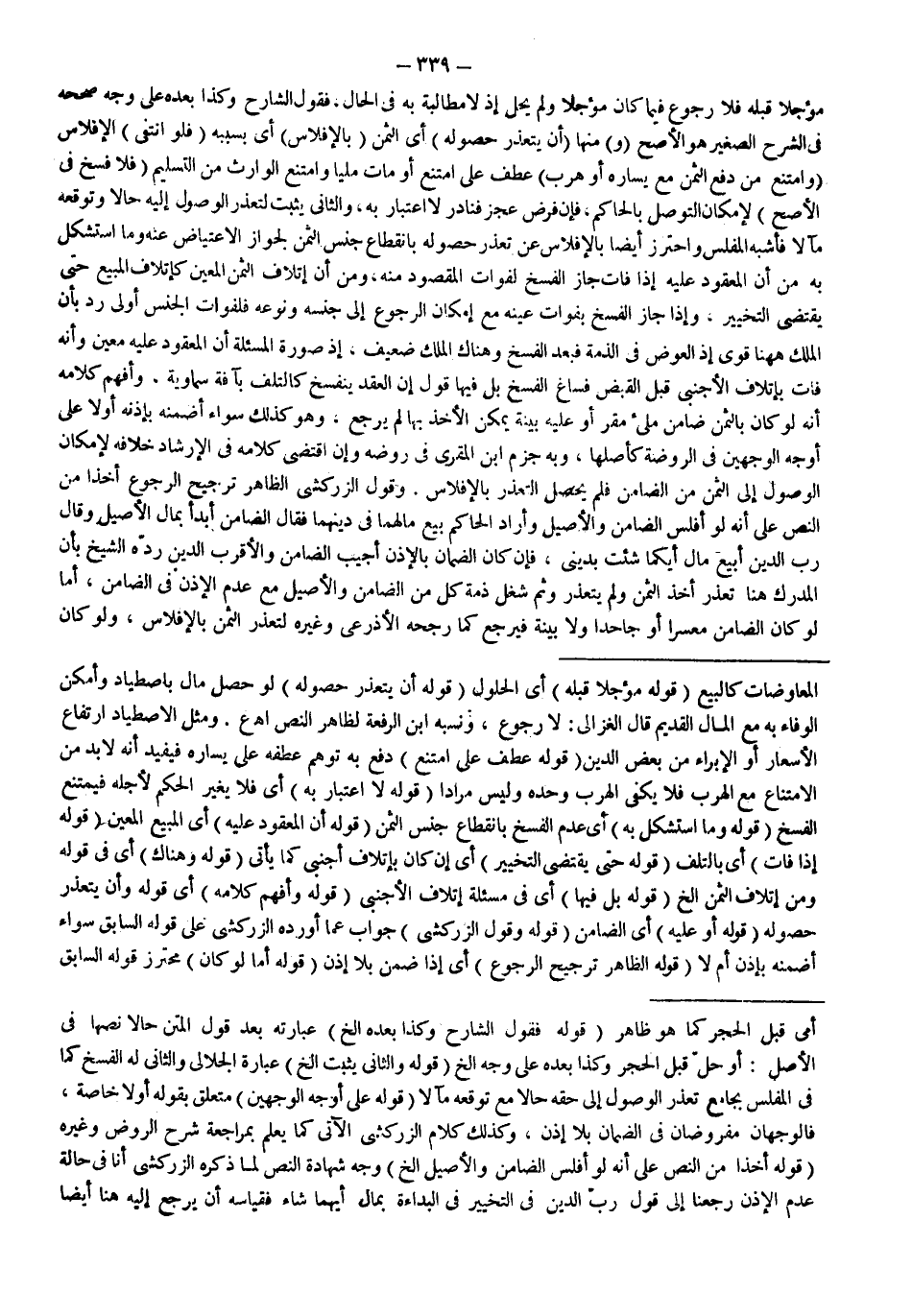 مُؤَجَّلًا قَبْلَهُ فَلَا رُجُوعَ فِيمَا كَانَ مُؤَجَّلًا وَلَمْ يَحِلَّ؛ إذْ لَا مُطَالَبَةَ بِهِ فِي الْحَالِ، فَقَوْلُ الشَّارِحِ وَكَذَا بَعْدَهُ عَلَى وَجْهٍ صَحَّحَهُ فِي الشَّرْحِ الصَّغِيرِ هُوَ الْأَصَحُّ (وَ) مِنْهَا (أَنْ يَتَعَذَّرَ حُصُولُهُ) أَيْ الثَّمَنِ (بِالْإِفْلَاسِ) أَيْ بِسَبَبِهِ (فَلَوْ) (انْتَفَى) الْإِفْلَاسُ (وَامْتَنَعَ مِنْ دَفْعِ الثَّمَنِ مَعَ يَسَارِهِ أَوْ هَرَبَ) عَطْفٌ عَلَى امْتَنَعَ أَوْ مَاتَ مَلِيًّا وَامْتَنَعَ الْوَارِثُ مِنْ التَّسْلِيمِ (فَلَا فَسْخَ فِي الْأَصَحِّ) لِإِمْكَانِ التَّوَصُّلِ بِالْحَاكِمِ، فَإِنْ فُرِضَ عَجْزٌ فَنَادِرٌ لَا اعْتِبَارَ بِهِ، وَالثَّانِي يَثْبُتُ لِتَعَذُّرِ الْوُصُولِ إلَيْهِ حَالًّا وَتَوَقُّعِهِ مَآلًا فَأَشْبَهَ الْمُفْلِسَ وَاحْتُرِزَ أَيْضًا بِالْإِفْلَاسِ عَنْ تَعَذُّرِ حُصُولِهِ بِانْقِطَاعِ جِنْسِ الثَّمَنِ لِجَوَازِ الِاعْتِيَاضِ عَنْهُ، وَمَا اُسْتُشْكِلَ بِهِ مِنْ أَنَّ الْمَعْقُودَ عَلَيْهِ إذَا فَاتَ جَازَ الْفَسْخُ لِفَوَاتِ الْمَقْصُودِ مِنْهُ، وَمِنْ أَنَّ إتْلَافَ الثَّمَنِ الْمُعَيَّنِ كَإِتْلَافِ الْمَبِيعِ حَتَّى يَقْتَضِيَ التَّخْيِيرَ، وَإِذَا جَازَ الْفَسْخُ بِفَوَاتِ عَيْنِهِ مَعَ إمْكَانِ الرُّجُوعِ إلَى جِنْسِهِ وَنَوْعِهِ فَلِفَوَاتِ الْجِنْسِ أَوْلَى رُدَّ بِأَنَّ الْمِلْكَ هَا هُنَا قَوِيٌّ؛ إذْ الْعِوَضُ فِي الذِّمَّةِ فَبَعْدَ الْفَسْخِ وَهُنَاكَ الْمِلْكُ ضَعِيفٌ، إذْ صُورَةُ الْمَسْأَلَةِ أَنَّ الْمَعْقُودَ عَلَيْهِ مُعَيَّنٌ وَأَنَّهُ فَاتَ بِإِتْلَافِ الْأَجْنَبِيِّ قَبْلَ الْقَبْضِ فَسَاغَ الْفَسْخُ بَلْ فِيهَا قَوْلٌ: إنَّ الْعَقْدَ يَنْفَسِخُ كَالتَّالِفِ بِآفَةٍ سَمَاوِيَّةٍ، وَأَفْهَمَ كَلَامُهُ أَنَّهُ لَوْ كَانَ بِالثَّمَنِ ضَامِنٌ مَلِيءٌ مُقِرٌّ أَوْ عَلَيْهِ بَيِّنَةٌ يُمْكِنُ الْأَخْذُ بِهَا لَمْ يَرْجِعْ، وَهُوَ كَذَلِكَ سَوَاءٌ أَضَمِنَهُ بِإِذْنِهِ أَوْ لَا عَلَى أَوْجَهِ الْوَجْهَيْنِ فِي الرَّوْضَةِ كَأَصْلِهَا، وَبِهِ جَزَمَ ابْنُ الْمُقْرِي فِي رَوْضِهِ وَإِنْ اقْتَضَى كَلَامُهُ فِي الْإِرْشَادِ خِلَافَهُ لِإِمْكَانِ الْوُصُولِ إلَى الثَّمَنِ مِنْ الضَّامِنِ فَلَمْ يَحْصُلْ التَّعَذُّرُ بِالْإِفْلَاسِ.