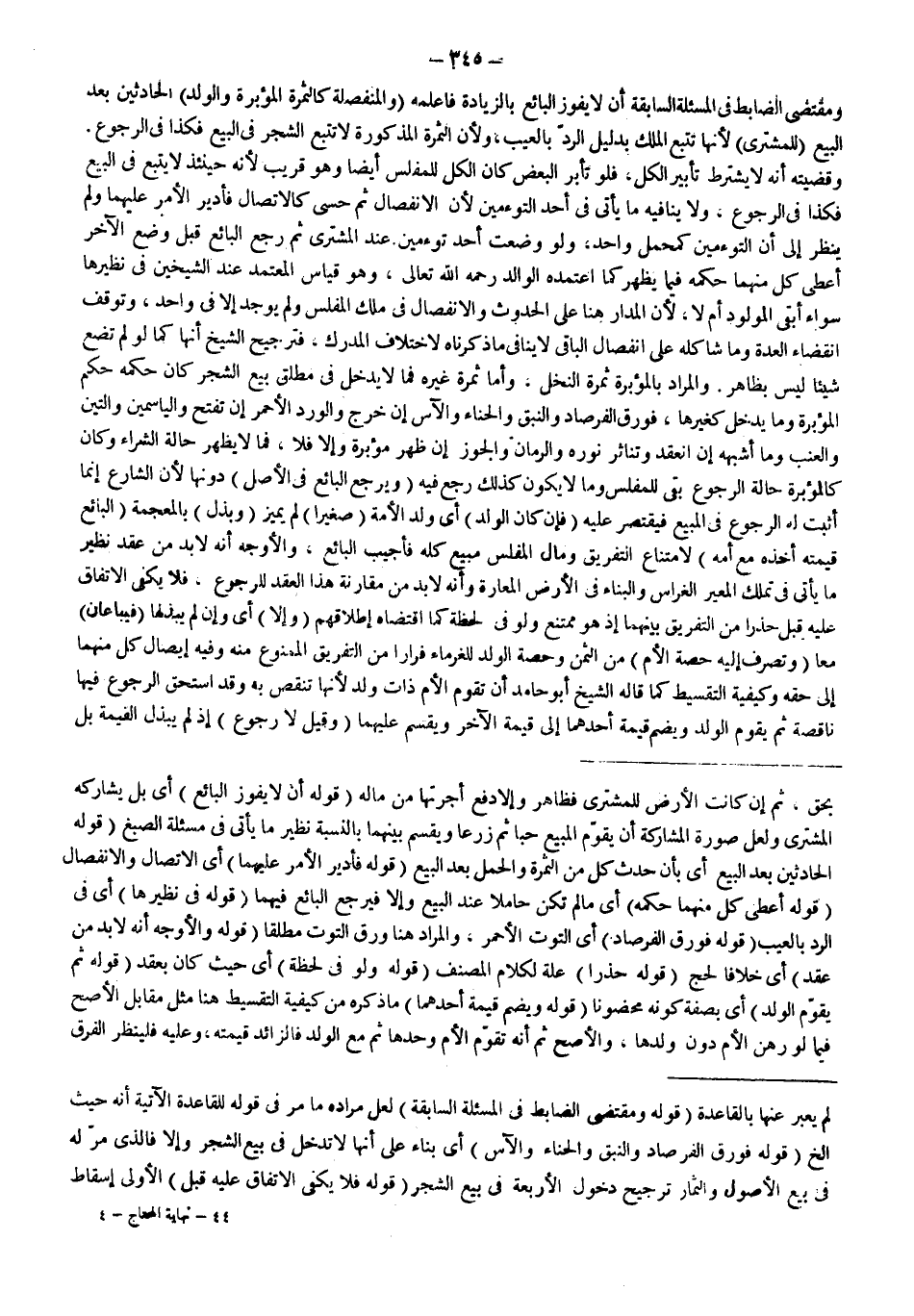 وَمُقْتَضَى الضَّابِطِ فِي الْمَسْأَلَةِ السَّابِقَةِ أَنْ لَا يَفُوزَ الْبَائِعُ بِالزِّيَادَةِ فَاعْلَمْهُ (وَالْمُنْفَصِلَةُ كَالثَّمَرَةِ الْمُؤَبَّرَةِ وَالْوَلَدِ) الْحَادِثَيْنِ بَعْدَ الْبَيْعِ (لِلْمُشْتَرِي) ؛ لِأَنَّهَا تَتْبَعُ الْمِلْكَ بِدَلِيلِ الرَّدِّ بِالْعَيْبِ، وَلِأَنَّ الثَّمَرَةَ الْمَذْكُورَةَ لَا تَتْبَعُ الشَّجَرَ فِي الْبَيْعِ فَكَذَا فِي الرُّجُوعِ وَقَضِيَّتُهُ أَنَّهُ لَا يُشْتَرَطُ تَأْبِيرُ الْكُلِّ، فَلَوْ تَأَبَّرَ الْبَعْضُ كَانَ الْكُلُّ لِلْمُفْلِسِ أَيْضًا وَهُوَ قَرِيبٌ؛ لِأَنَّهُ حِينَئِذٍ لَا يَتْبَعُ فِي الْبَيْعِ فَكَذَا فِي الرُّجُوعِ، وَلَا يُنَافِيهِ مَا يَأْتِي فِي أَحَدِ التَّوْأَمَيْنِ؛ لِأَنَّ الِانْفِصَالَ ثَمَّ حِسِّيٌّ كَالِاتِّصَالِ فَأُدِيرَ الْأَمْرُ عَلَيْهِمَا وَلَمْ يُنْظَرْ إلَى أَنَّ التَّوْأَمَيْنِ كَمَحْمَلٍ وَاحِدٍ، وَلَوْ وَضَعَتْ أَحَدَ تَوْأَمَيْنِ عِنْدَ الْمُشْتَرِي ثُمَّ رَجَعَ الْبَائِعُ قَبْلَ وَضْعِ الْآخَرِ أُعْطِيَ كُلٌّ مِنْهُمَا حُكْمَهُ فِيمَا يَظْهَرُ كَمَا اعْتَمَدَهُ الْوَالِدُ - رَحِمَهُ اللَّهُ تَعَالَى -، وَهُوَ قِيَاسُ الْمُعْتَمَدِ عِنْدَ الشَّيْخَيْنِ فِي نَظِيرِهَا سَوَاءٌ أَبَقِيَ الْمَوْلُودُ أَمْ لَا؛ لِأَنَّ الْمَدَارَ هُنَا عَلَى الْحُدُوثِ وَالِانْفِصَالِ فِي مِلْكِ الْمُفْلِسِ وَلَمْ يُوجَدْ إلَّا فِي وَاحِدٍ، وَتَوَقُّفُ انْقِضَاءِ الْعِدَّةِ وَمَا شَاكَلَهُ عَلَى انْفِصَالِ الْبَاقِي لَا يُنَافِي مَا ذَكَرْنَاهُ لِاخْتِلَافِ الْمُدْرَكِ، فَتَرْجِيحُ الشَّيْخِ أَنَّهَا كَمَا لَوْ لَمْ تَضَعْ شَيْئًا لَيْسَ بِظَاهِرٍ.