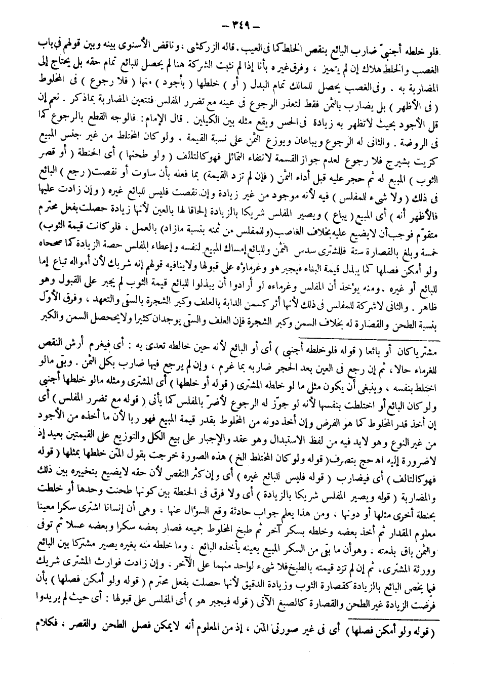 وَبَقِيَ مَا لَوْ اخْتَلَطَ بِنَفْسِهِ، وَيَنْبَغِي أَنْ يَكُونَ مِثْلَ مَا لَوْ خَلَطَهُ الْمُشْتَرِي (قَوْلُهُ: أَوْ خَلَطَهَا) أَيْ الْمُشْتَرِي، وَمِثْلُهُ مَا لَوْ خَلَطَهَا أَجْنَبِيٌّ، وَلَوْ كَانَ الْبَائِعُ أَوْ اخْتَلَطَتْ بِنَفْسِهَا؛ لِأَنَّهُ لَوْ جُوِّزَ لَهُ الرُّجُوعُ لَأَضَرَّ بِالْمُفْلِسِ كَمَا يَأْتِي (قَوْلُهُ: مَعَ تَضَرُّرِ الْمُفْلِسِ) أَيْ إنْ أَخَذَ قَدْرَ الْمَخْلُوطِ كَمَا هُوَ الْفَرْضُ، وَإِنْ أَخَذَ دُونَهُ مِنْ الْمَخْلُوطِ بِقَدْرِ الْمَبِيعِ فَهُوَ رِبًا؛ لِأَنَّ مَا أَخَذَهُ مِنْ الْأَجْوَدِ مِنْ غَيْرِ النَّوْعِ وَهُوَ لَا بُدَّ فِيهِ مِنْ لَفْظِ الِاسْتِبْدَالِ وَهُوَ عَقْدٌ وَالْإِجْبَارُ عَلَى بَيْعِ الْكُلِّ وَالتَّوْزِيعُ عَلَى الْقِيمَتَيْنِ بَعِيدٌ؛ إذْ لَا ضَرُورَةَ إلَيْهِ اهـ حَجّ بِتَصَرُّفٍ