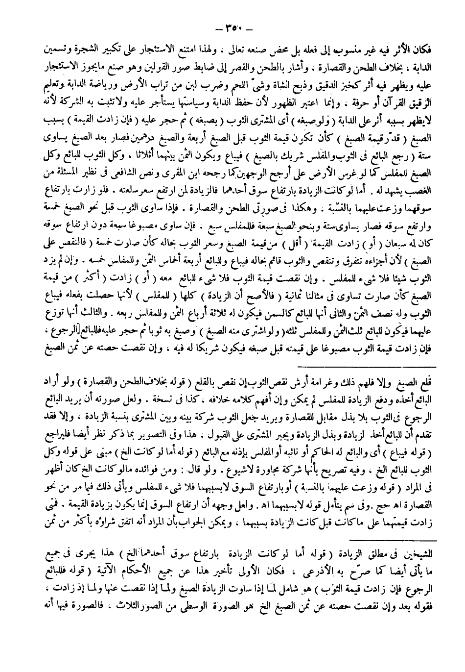 ـــــــــــــــــــــــــــــQالشَّيْخَيْنِ فِي مُطْلَقِ الزِّيَادَةِ. (قَوْلُهُ: أَمَّا لَوْ كَانَتْ الزِّيَادَةُ بِارْتِفَاعِ سُوقِ أَحَدِهِمَا إلَخْ) هَذَا يَجْرِي فِي جَمِيعِ مَا يَأْتِي أَيْضًا كَمَا صَرَّحَ بِهِ الْأَذْرَعِيُّ، فَكَانَ الْأَوْلَى تَأْخِيرَ هَذَا عَنْ جَمِيعِ الْأَحْكَامِ الْآتِيَةِ. (قَوْلُهُ: فَلِلْبَائِعِ الرُّجُوعُ فَإِنْ زَادَتْ قِيمَةُ الثَّوْبِ) هُوَ شَامِلٌ لِمَا إذَا سَاوَتْ الزِّيَادَةُ الصَّبْغَ وَلِمَا إذَا نَقَصَتْ عَنْهَا وَلِمَا إذَا زَادَتْ، فَقَوْلُهُ: بَعْدَ وَإِنْ نَقَصَتْ حِصَّتُهُ عَنْ ثَمَنِ الصَّبْغِ إلَخْ هُوَ الصُّورَةُ الْوُسْطَى مِنْ الصُّوَرِ الثَّلَاثِ، فَالصُّورَةُ فِيهَا أَنَّهُ