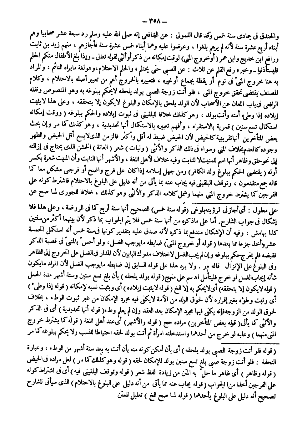وَالْخَنْدَقِ فِي جُمَادَى سَنَةَ خَمْسٍ وَقَدْ قَالَ الْقَمُولِيُّ: عَنْ الشَّافِعِيِّ «إنَّهُ - صَلَّى اللَّهُ عَلَيْهِ وَسَلَّمَ - رَدَّ سَبْعَةَ عَشَرَ صَحَابِيًّا وَهُمْ أَبْنَاءُ أَرْبَعَ عَشْرَةَ سَنَةً؛ لِأَنَّهُ لَمْ يَرَهُمْ بَلَغُوا، وَعُرِضُوا عَلَيْهِ وَهُمْ أَبْنَاءُ خَمْسَ عَشْرَةَ سَنَةً فَأَجَازَهُمْ، مِنْهُمْ زَيْدُ بْنُ ثَابِتٍ وَرَافِعُ بْنُ خَدِيجٍ وَابْنُ عُمَرَ» (أَوْ خُرُوجُ الْمَنِيِّ) لِوَقْتِ إمْكَانِهِ مِنْ ذَكَرٍ أَوْ أُنْثَى لِقَوْلِهِ تَعَالَى {وَإِذَا بَلَغَ الأَطْفَالُ مِنْكُمُ الْحُلُمَ فَلْيَسْتَأْذِنُوا} [النور: 59] وَخَبَرُ «رُفِعَ الْقَلَمُ عَنْ ثَلَاثٍ: عَنْ الصَّبِيِّ حَتَّى يَحْتَلِمَ» .