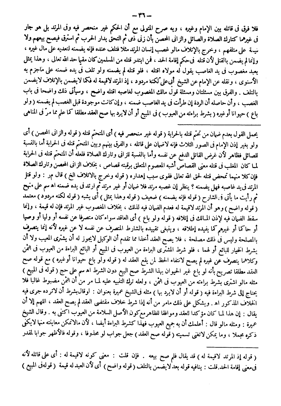 ـــــــــــــــــــــــــــــSيُحْمَلُ الْقَوْلُ بِعَدَمِ ضَمَانِ مَنْ تَحَتَّمَ قَتْلُهُ بِالْحِرَابَةِ (قَوْلُهُ: غَيْرُ مُنْحَصِرٍ فِيهِ) أَيْ الْمُتَحَتِّمِ قَتْلُهُ (قَوْلُهُ: وَالزَّانِي الْمُحْصَنِ) أَيْ وَلَوْ بِغَيْرِ إذْنِ الْإِمَامِ فِي الصُّوَرِ الثَّلَاثِ فَإِنَّهُ لَا ضَمَانَ عَلَى قَاتِلِهِ، وَالْفَرْقُ بَيْنَهُمْ وَبَيْنَ الْمُتَحَتِّمِ قَتْلُهُ فِي الْحِرَابَةِ أَمَّا بِالنِّسْبَةِ لِلصَّائِلِ فَظَاهِرٌ لِأَنَّ غَرَضَ الْقَاتِلِ الدَّفْعُ عَنْ نَفْسِهِ وَأَمَّا بِالنِّسْبَةِ لِلزَّانِي وَتَارِكِ الصَّلَاةِ فَلَعَلَّهُ أَنَّ الْمُتَحَتِّمَ قَتْلُهُ فِي الْحِرَابَةِ لَمَّا كَانَ الْمُغَلَّبُ فِي قَتْلِهِ مَعْنَى الْقِصَاصِ أَشْبَهَ الْمَعْصُومَ الْمُتَعَلِّقَ بِرَقَبَتِهِ قِصَاصٌ، بِخِلَافِ الزَّانِي الْمُحْصَنِ وَتَارِكِ الصَّلَاةِ فَإِنَّ كُلًّا مِنْهُمَا تَمَحَّضَ قَتْلُهُ لِحَقِّ اللَّهِ تَعَالَى فَقَوِيَ سَبَبُ إهْدَارِهِ (قَوْلُهُ: وَخَرَجَ بِالْإِتْلَافِ إلَخْ) قَالَ مَرَّ: وَلَوْ قُتِلَ الْمُرْتَدُّ فِي يَدِ غَاصِبِهِ فَهَلْ يَضْمَنُهُ؟ يُنْظَرُ إنْ غَصَبَهُ مُرْتَدٌّ فَلَا ضَمَانَ أَوْ غَيْرَ مُرْتَدٍّ ثُمَّ ارْتَدَّ فِي يَدِهِ ضَمِنَهُ اهـ سم عَلَى مَنْهَجٍ ثُمَّ رَأَيْت مَا يَأْتِي فِي الشَّارِحِ (قَوْلُهُ: فَإِنَّهُ يَضْمَنُهُ) ضَعِيفٌ (قَوْلُهُ: وَهَذَا يُمَثَّلُ) أَيْ يُشَبَّهُ (قَوْلُهُ لَكِنَّهُ مَرْدُودٌ) مُعْتَمَدٌ (قَوْلُهُ: وَاضِحٌ) وَهُوَ أَنَّ الْمُرْتَدَّ لَا قِيمَةَ لَهُ فَعَدِمَ الضَّمَانُ فِيهِ لِذَلِكَ، بِخِلَافِ الْمَغْصُوبِ غَيْرِ الْمُرْتَدِّ فَإِنَّ لَهُ قِيمَةً، وَإِنَّمَا سَقَطَ الضَّمَانُ فِيهِ لِإِذْنِ الْمَالِكِ فِي إتْلَافِهِ.