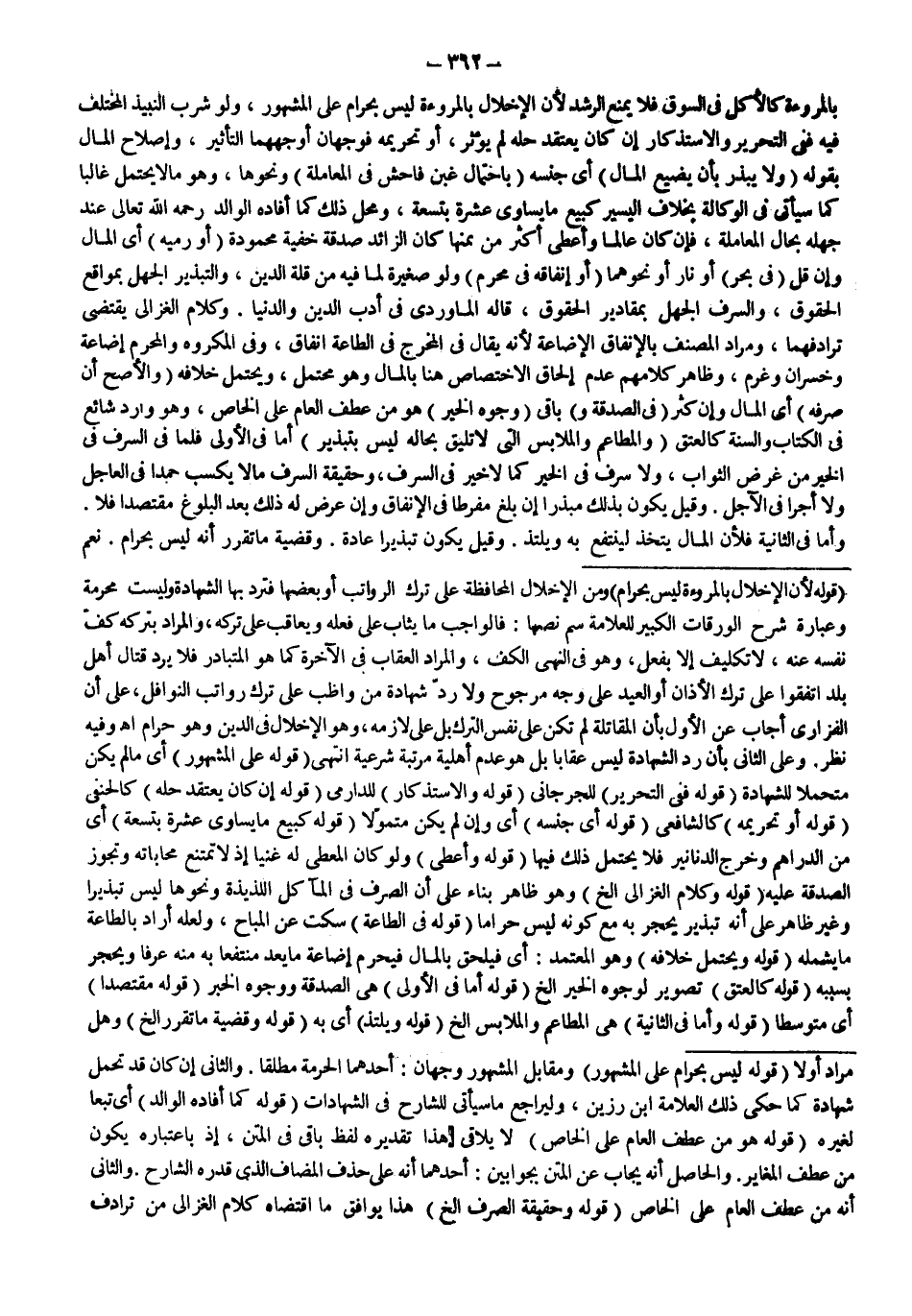 بِالْمُرُوءَةِ كَالْأَكْلِ فِي السُّوقِ فَلَا يَمْنَعُ الرُّشْدَ؛ لِأَنَّ الْإِخْلَالَ بِالْمُرُوءَةِ لَيْسَ بِحَرَامٍ عَلَى الْمَشْهُورِ، وَلَوْ شَرِبَ النَّبِيذَ الْمُخْتَلَفَ فِيهِ فَفِي التَّحْرِيرِ وَالِاسْتِذْكَارِ إنْ كَانَ يَعْتَقِدُ حِلَّهُ لَمْ يُؤَثِّرْ، أَوْ تَحْرِيمَهُ فَوَجْهَانِ أَوْجَهُهُمَا التَّأْثِيرُ، وَإِصْلَاحُ الْمَالِ بِقَوْلِهِ (وَلَا يُبَذِّرُ بِأَنْ يُضَيِّعَ الْمَالَ) أَيْ جِنْسَهُ (بِاحْتِمَالِ غَبْنٍ فَاحِشٍ فِي الْمُعَامَلَةِ) وَنَحْوِهَا، وَهُوَ مَا لَا يُحْتَمَلُ غَالِبًا كَمَا سَيَأْتِي فِي الْوَكَالَةِ بِخِلَافِ الْيَسِيرِ كَبَيْعِ مَا يُسَاوِي عَشَرَةً بِتِسْعَةٍ، وَمَحَلُّ ذَلِكَ كَمَا أَفَادَهُ الْوَالِدُ - رَحِمَهُ اللَّهُ تَعَالَى - عِنْدَ جَهْلِهِ بِحَالِ الْمُعَامَلَةِ، فَإِنْ كَانَ عَالِمًا وَأَعْطَى أَكْثَرَ مِنْ ثَمَنِهَا كَانَ الزَّائِدُ صَدَقَةً خَفِيَّةً مَحْمُودَةً (أَوْ رَمْيِهِ) أَيْ الْمَالَ وَإِنْ قَلَّ (فِي بَحْرٍ) أَوْ نَارٍ أَوْ نَحْوِهِمَا (أَوْ إنْفَاقِهِ فِي مُحَرَّمٍ) وَلَوْ صَغِيرَةً لِمَا فِيهِ مِنْ قِلَّةِ الدِّينِ، وَالتَّبْذِيرُ الْجَهْلُ بِمَوَاقِعِ الْحُقُوقِ، وَالسَّرَفُ الْجَهْلُ بِمَقَادِيرِ الْحُقُوقِ، قَالَهُ الْمَاوَرْدِيُّ فِي أَدَبِ الدِّينِ وَالدُّنْيَا.