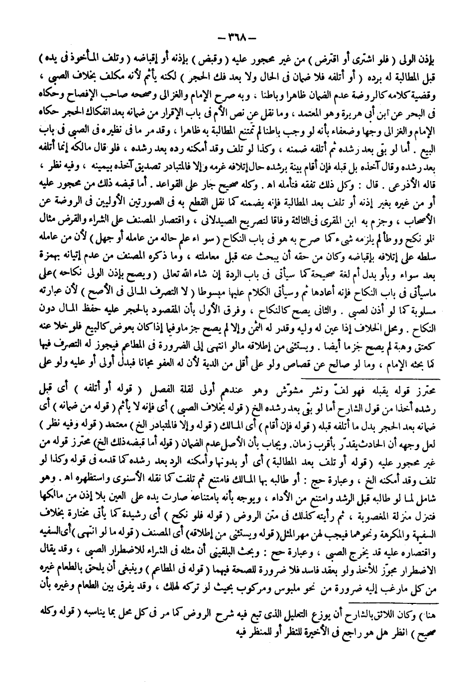 أَمَّا قَبْضُهُ ذَلِكَ مِنْ مَحْجُورٍ عَلَيْهِ أَوْ مِنْ غَيْرِهِ بِغَيْرِ إذْنِهِ أَوْ تَلِفَ بَعْدَ الْمُطَالَبَةِ فَإِنَّهُ يَضْمَنُهُ كَمَا نَقَلَ الْقَطْعَ بِهِ فِي الصُّورَتَيْنِ الْأُولَيَيْنِ فِي الرَّوْضَةِ عَنْ الْأَصْحَابِ، وَجَزَمَ بِهِ ابْنُ الْمُقْرِي فِي الثَّالِثَةِ وِفَاقًا لِتَصْرِيحِ الصَّيْدَلَانِيِّ، وَاقْتِصَارُ الْمُصَنِّفِ عَلَى الشِّرَاءِ وَالْقَرْضِ مِثَالٌ فَلَوْ نَكَحَ وَوَطِئَ لَمْ يَلْزَمْهُ شَيْءٌ كَمَا صَرَّحَ بِهِ هُوَ فِي بَابِ النِّكَاحِ (سَوَاءٌ عُلِمَ حَالُهُ مِنْ عَامِلِهِ أَوْ جُهِلَ) ؛ لِأَنَّ مَنْ عَامَلَهُ سَلَّطَهُ عَلَى إتْلَافِهِ بِإِقْبَاضِهِ وَكَانَ مِنْ حَقِّهِ أَنْ يَبْحَثَ عَنْهُ قَبْلَ مُعَامَلَتِهِ، وَمَا ذَكَرَهُ الْمُصَنِّفُ مِنْ عَدَمِ إتْيَانِهِ بِهَمْزَةٍ بَعْدَ سَوَاءٍ وَبِأَوْ بَدَلَ أَمْ لُغَةٌ صَحِيحَةٌ كَمَا سَيَأْتِي فِي بَابِ الرِّدَّةِ إنْ شَاءَ اللَّهُ تَعَالَى (وَيَصِحُّ بِإِذْنِ الْوَلِيِّ نِكَاحُهُ) عَلَى مَا سَيَأْتِي فِي بَابِ النِّكَاحِ فَإِنَّهُ أَعَادَهَا ثَمَّ وَسَيَأْتِي الْكَلَامُ عَلَيْهَا مَبْسُوطًا (لَا) (التَّصَرُّفُ الْمَالِيُّ) (فِي الْأَصَحِّ) ؛ لِأَنَّ عِبَارَتَهُ مَسْلُوبَةٌ كَمَا لَوْ أَذِنَ لِصَبِيٍّ.