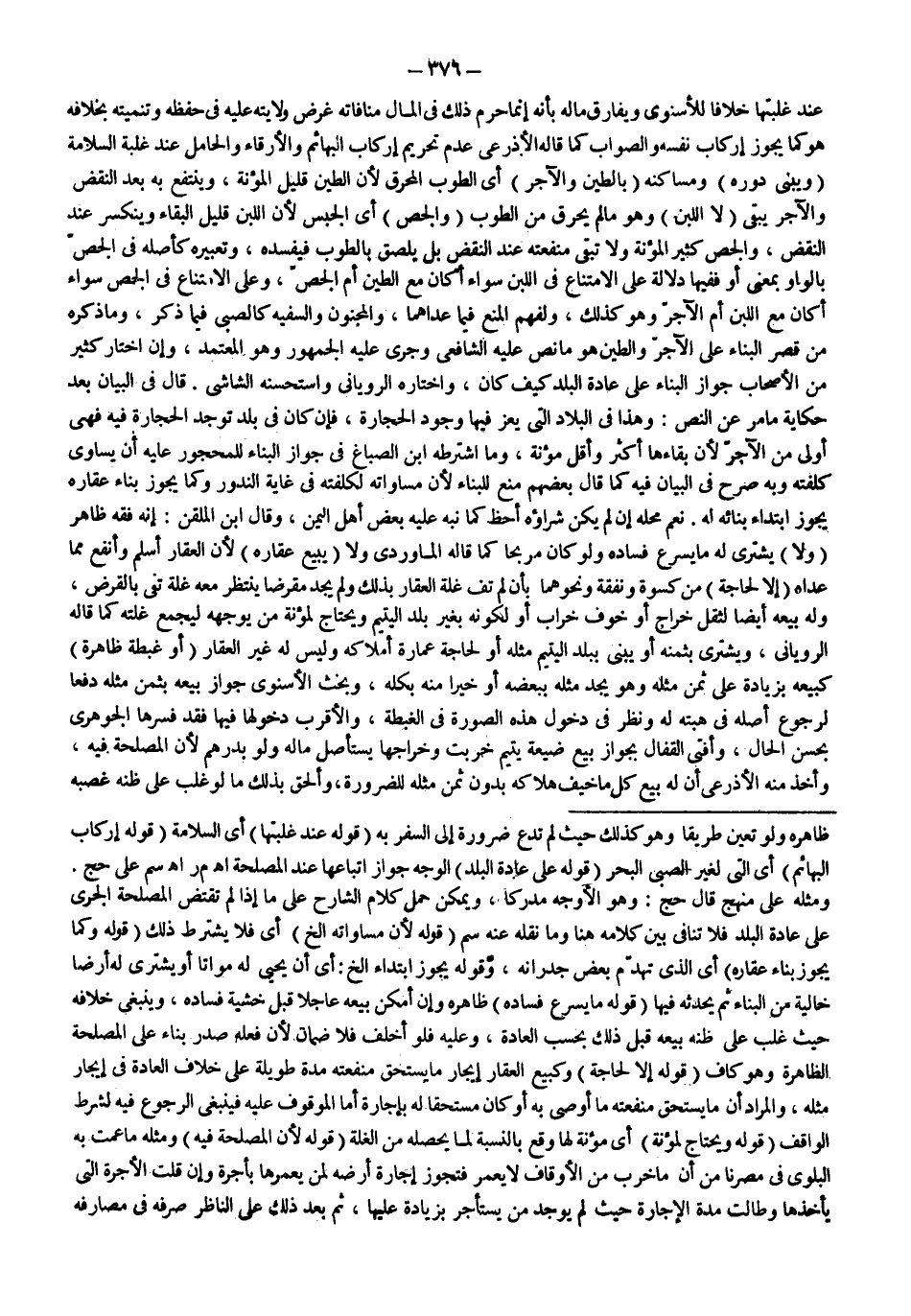 عِنْدَ غَلَبَتِهَا خِلَافًا لِلْإِسْنَوِيِّ وَيُفَارِقُ مَالَهُ بِأَنَّهُ إنَّمَا حَرَّمَ ذَلِكَ فِي الْمَالِ مُنَافَاتُهُ غَرَضَ وَلَايَتِهِ عَلَيْهِ فِي حِفْظِهِ وَتَنْمِيَتِهِ بِخِلَافِهِ هُوَ كَمَا يَجُوزُ إرْكَابُ نَفْسِهِ، وَالصَّوَابُ كَمَا قَالَهُ الْأَذْرَعِيُّ عَدَمُ تَحْرِيمِ إرْكَابِ الْبَهَائِمِ وَالْأَرِقَّاءِ وَالْحَامِلِ عِنْدَ غَلَبَةِ السَّلَامَةِ (وَيَبْنِي دُورَهُ) وَمَسَاكِنَهُ (بِالطِّينِ وَالْآجُرِّ) أَيْ الطُّوبِ الْمُحْرَقِ؛ لِأَنَّ الطِّينَ قَلِيلُ الْمُؤْنَةِ، وَيَنْتَفِعُ بِهِ بَعْدَ النَّقْضِ، وَالْآجُرُّ يَبْقَى (لَا اللَّبِنِ) وَهُوَ مَا لَمْ يُحْرَقْ مِنْ الطُّوبِ (وَالْجِصِّ) أَيْ الْجِبْسِ؛ لِأَنَّ اللَّبِنَ قَلِيلُ الْبَقَاءِ وَيَنْكَسِرُ عِنْدَ النَّقْضِ، وَالْجِصُّ كَثِيرُ الْمُؤْنَةِ وَلَا تَبْقَى مَنْفَعَتُهُ عِنْدَ النَّقْضِ بَلْ يُلْصَقُ بِالطُّوبِ فَيُفْسِدُهُ، وَتَعْبِيرُهُ كَأَصْلِهِ فِي الْجِصِّ بِالْوَاوِ بِمَعْنَى أَوْ فَفِيهَا دَلَالَةٌ عَلَى الِامْتِنَاعِ فِي اللَّبِنِ سَوَاءٌ أَكَانَ مَعَ الطِّينِ أَمْ الْجِصِّ، وَعَلَى الِامْتِنَاعِ فِي الْجِصِّ سَوَاءٌ أَكَانَ مَعَ اللَّبِنِ أَمْ الْآجُرِّ وَهُوَ كَذَلِكَ، وَلِفَهْمِ الْمَنْعِ فِيمَا عَدَاهُمَا، وَالْمَجْنُونُ وَالسَّفِيهُ كَالصَّبِيِّ فِيمَا ذُكِرَ، وَمَا ذَكَرَهُ مِنْ قَصْرِ الْبِنَاءِ عَلَى الْآجُرِّ وَالطِّينِ هُوَ مَا نَصَّ عَلَيْهِ الشَّافِعِيُّ وَجَرَى عَلَيْهِ الْجُمْهُورُ، وَهُوَ الْمُعْتَمَدُ، وَإِنْ اخْتَارَ كَثِيرٌ مِنْ الْأَصْحَابِ جَوَازَ الْبِنَاءِ عَلَى عَادَةِ الْبَلَدِ كَيْفَ كَانَ، وَاخْتَارَهُ الرُّويَانِيُّ وَاسْتَحْسَنَهُ الشَّاشِيُّ.