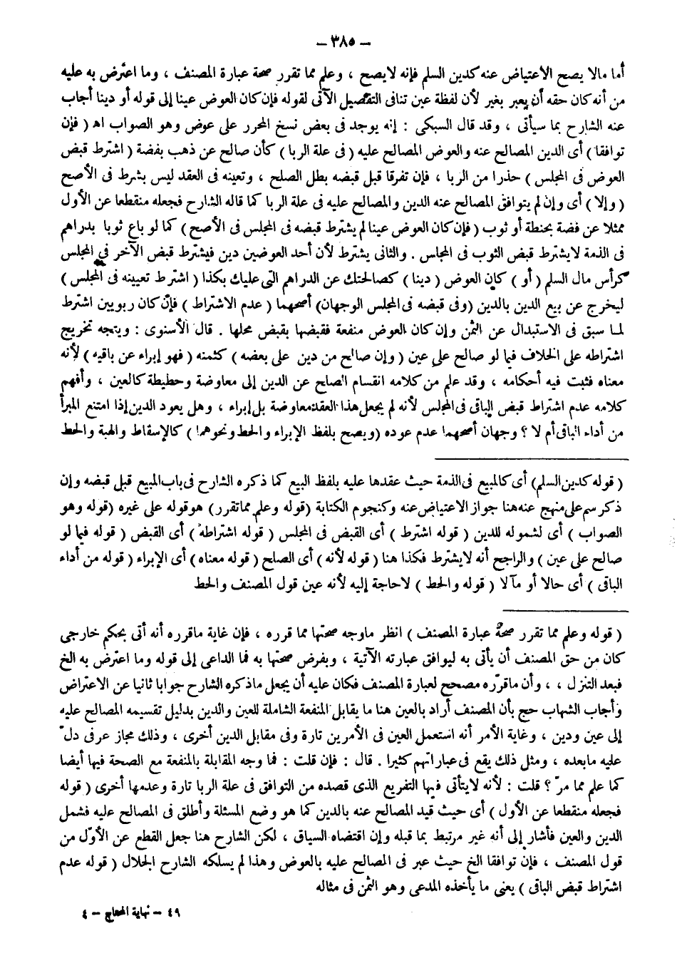 ـــــــــــــــــــــــــــــQ (قَوْلُهُ: وَعُلِمَ مِمَّا تَقَرَّرَ صِحَّةُ عِبَارَةِ الْمُصَنِّفِ) اُنْظُرْ مَا وَجْهُ صِحَّتِهَا مِمَّا قَرَّرَهُ؛ فَإِنَّ غَايَةَ مَا قَرَّرَهُ أَنَّهُ أَتَى بِحُكْمٍ خَارِجِيٍّ كَانَ مِنْ حَقِّ الْمُصَنِّفِ أَنْ يَأْتِيَ بِهِ لِيُوَافِقَ عِبَارَتَهُ الْآتِيَةَ، وَبِفَرْضِ صِحَّتِهَا بِهِ فَمَا الدَّاعِي إلَى قَوْلِهِ وَمَا اُعْتُرِضَ بِهِ إلَخْ فَبَعْدَ التَّنَزُّلِ، وَأَنَّ مَا قَرَّرَهُ مُصَحِّحٌ لِعِبَارَةِ الْمُصَنِّفِ فَكَانَ عَلَيْهِ أَنْ يَجْعَلَ مَا ذَكَرَهُ الشَّارِحُ جَوَابًا ثَانِيًا عَنْ الِاعْتِرَاضِ وَأَجَابَ الشِّهَابُ حَجّ بِأَنَّ الْمُصَنِّفَ أَرَادَ بِالْعَيْنِ هُنَا مَا يُقَابِلُ الْمَنْفَعَةَ الشَّامِلَةَ لِلْعَيْنِ وَالدَّيْنِ بِدَلِيلِ تَقْسِيمِهِ الْمُصَالَحِ عَلَيْهِ إلَى عَيْنٍ وَدَيْنٍ، وَغَايَةُ الْأَمْرِ أَنَّهُ اسْتَعْمَلَ الْعَيْنَ فِي الْأَمْرَيْنِ تَارَةً وَفِي مُقَابِلِ الدَّيْنِ أُخْرَى، وَذَلِكَ مَجَازٌ عُرْفِيٌّ دَلَّ عَلَيْهِ مَا بَعْدَهُ، وَمِثْلُ ذَلِكَ يَقَعُ فِي عِبَارَاتِهِمْ كَثِيرًا. قَالَ: فَإِنْ قُلْت: فَمَا وَجْهُ الْمُقَابَلَةِ بِالْمَنْفَعَةِ مَعَ الصِّحَّةِ فِيهَا أَيْضًا كَمَا عُلِمَ مِمَّا مَرَّ؟ قُلْت: لِأَنَّهُ لَا يَتَأَتَّى فِيهَا التَّفْرِيعُ الَّذِي قَصَدَهُ مِنْ التَّوَافُقِ فِي عِلَّةِ الرِّبَا تَارَةً وَعَدَمِهَا أُخْرَى (قَوْلُهُ: فَجَعَلَهُ مُنْقَطِعًا عَنْ الْأَوَّلِ) أَيْ: حَيْثُ قَيَّدَ الْمُصَالَحَ عَنْهُ بِالدَّيْنِ كَمَا هُوَ وَضْعُ الْمَسْأَلَةِ وَأَطْلَقَ فِي الْمُصَالَحِ عَلَيْهِ فَشَمِلَ الدَّيْنَ وَالْعَيْنَ فَأَشَارَ إلَى أَنَّهُ غَيْرُ مُرْتَبِطٍ بِمَا قَبْلَهُ وَإِنْ اقْتَضَاهُ السِّيَاقُ، لَكِنَّ الشَّارِحَ هُنَا جَعَلَ الْقَطْعَ عَنْ الْأَوَّلِ مِنْ قَوْلِ الْمُصَنِّفِ، فَإِنْ تَوَافَقَا إلَخْ حَيْثُ عَبَّرَ فِي الْمُصَالَحِ عَلَيْهِ بِالْعِوَضِ وَهَذَا لَمْ يَسْلُكْهُ الشَّارِحُ الْجَلَالُ