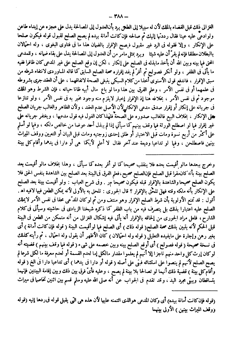 أَقُولُ: قَدْ تُمْنَعُ الْأَوْلَوِيَّةُ بِأَنَّ شَرْطَ الصُّلْحِ الْإِقْرَارُ، وَهُوَ مُنْتَفٍ وَمِنْ ثَمَّ لَوْ كَانَ الْمُدَّعِي مُحِقًّا فِي نَفْسِ الْأَمْرِ لَا يَمْلِكُ الصُّلْحَ عَلَيْهِ اعْتِبَارًا بِذَلِكَ بَلْ يَتَصَرَّفُ فِيهِ مِنْ بَابِ الظَّفَرِ كَمَا ذَكَرَهُ شَيْخُنَا الزِّيَادِيُّ فِي حَاشِيَتِهِ وَسَيَأْتِي فِي كَلَامِ الشَّارِحِ، فَلَعَلَّ مُرَادَ الْجُورِيُّ مِنْ إلْحَاقِهِ بِالْإِقْرَارِ أَنَّهُ يَأْتِي فِيهِ إشْكَالُ الْغَزَالِيِّ مِنْ أَنَّهُ مُتَمَكِّنٌ مِنْ الطَّعْنِ فِي الْبَيِّنَةِ قَبْلَ الْحُكْمِ؛ لِأَنَّهُ يَتَبَيَّنُ بِذَلِكَ صِحَّةُ الصُّلْحِ