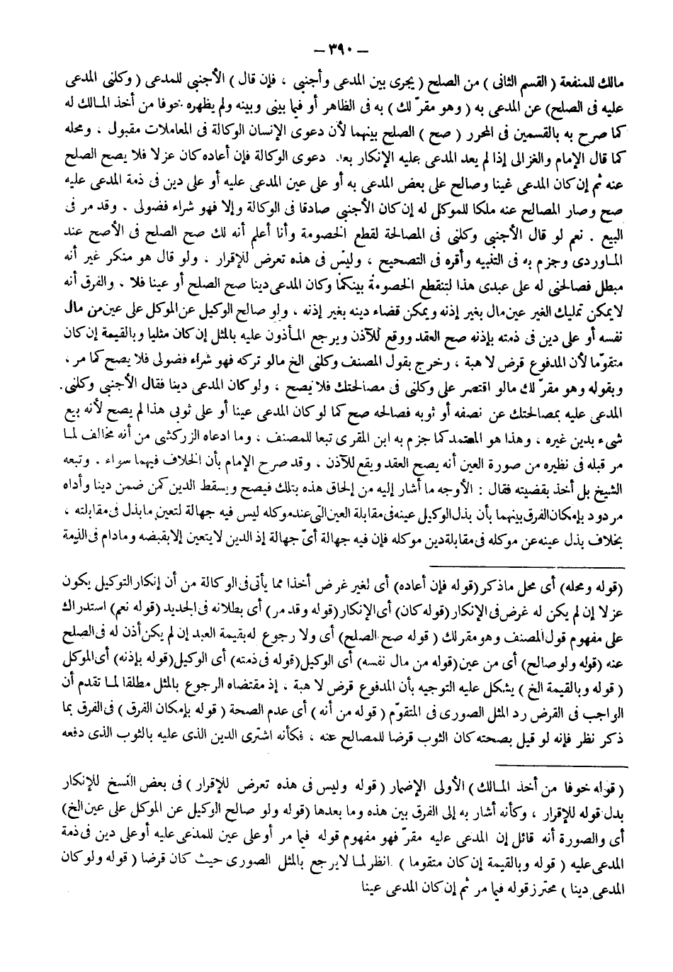 ـــــــــــــــــــــــــــــQقَوْلُهُ: خَوْفًا مِنْ أَخْذِ الْمَالِكِ) الْأَوْلَى الْإِضْمَارُ. (قَوْلُهُ: وَلَيْسَ فِي هَذِهِ تَعَرُّضٌ لِلْإِقْرَارِ) فِي بَعْضِ النُّسَخِ لِلْإِنْكَارِ بَدَلَ قَوْلِهِ لِلْإِقْرَارِ، وَكَأَنَّهُ أَشَارَ بِهِ إلَى الْفَرْقِ بَيْنَ هَذِهِ وَمَا بَعْدَهَا. (قَوْلُهُ: وَلَوْ صَالَحَ الْوَكِيلُ عَنْ الْمُوَكِّلِ عَلَى عَيْنٍ إلَخْ) أَيْ: وَالصُّورَةُ أَنَّهُ قَائِلٌ إنَّ الْمُدَّعَى عَلَيْهِ مُقِرٌّ فَهُوَ مَفْهُومُ قَوْلِهِ فِيمَا مَرَّ أَوْ عَلَى عَيْنٍ لِلْمُدَّعَى عَلَيْهِ أَوْ عَلَى دَيْنٍ فِي ذِمَّةِ الْمُدَّعَى عَلَيْهِ. (قَوْلُهُ: وَبِالْقِيمَةِ إنْ كَانَ مُتَقَوِّمًا) اُنْظُرْ لِمَا لَا يَرْجِعُ بِالْمِثْلِ الصُّورِيِّ حَيْثُ كَانَ قَرْضًا. (قَوْلُهُ: وَلَوْ كَانَ الْمُدَّعَى دَيْنًا) مُحْتَرَزُ قَوْلِهِ فِيمَا مَرَّ ثَمَّ إنْ كَانَ الْمُدَّعَى عَيْنًا