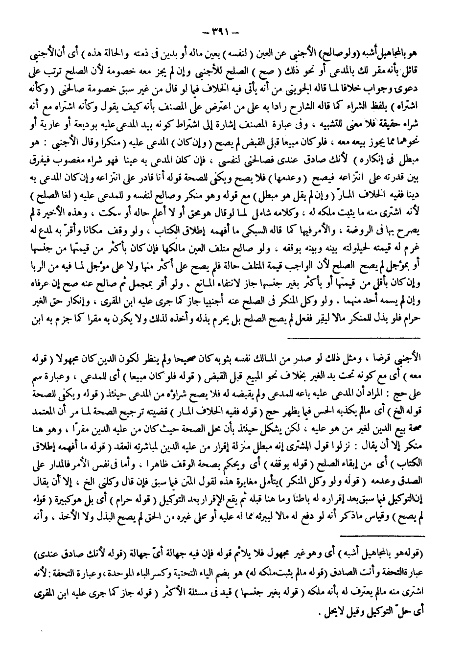 ـــــــــــــــــــــــــــــSالْأَجْنَبِيُّ قَرْضًا، وَمِثْلُ ذَلِكَ لَوْ صَدَرَ مِنْ الْمَالِكِ نَفْسِهِ بِثَوْبِهِ كَانَ صَحِيحًا وَلَمْ يُنْظَرْ لِكَوْنِ الدَّيْنِ كَانَ مَجْهُولًا