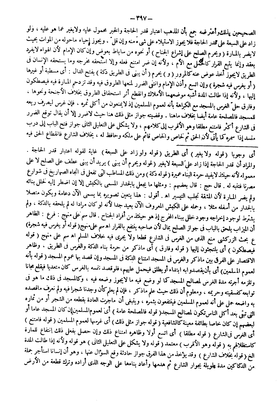 الصَّحِيحَيْنِ بِذَلِكَ وَاعْتَرَضَهُ جَمْعٌ بِأَنَّ الْمَذْهَبَ اعْتِبَارُ قَدْرِ الْحَاجَةِ وَالْخَبَرُ مَحْمُولٌ عَلَيْهِ وَلَا يُغَيَّرُ عَمَّا هُوَ عَلَيْهِ، وَلَوْ زَادَ عَلَى السَّبْعَةِ عَلَى قَدْرِ الْحَاجَةِ فَلَا يَجُوزُ الِاسْتِيلَاءُ عَلَى شَيْءٍ مِنْهُ وَإِنْ قَلَّ، وَيَجُوزُ إحْيَاءُ مَا حَوْلَهُ مِنْ الْمَوَاتِ بِحَيْثُ لَا يَضُرُّ بِالْمَارَّةِ (وَيَحْرُمُ الصُّلْحُ عَلَى إشْرَاعِ الْجَنَاحِ) أَوْ نَحْوِهِ مِنْ سَابَاطٍ بِعِوَضٍ وَإِنْ كَانَ الْإِمَامَ؛ لِأَنَّ الْهَوَاءَ لَا يُفْرَدُ بِعَقْدٍ، وَإِنَّمَا يُتَّبَعُ الْقَرَارُ كَالْحَمْلِ مَعَ الْأُمِّ، وَلِأَنَّهُ إنْ ضَرَّ امْتَنَعَ فِعْلُهُ وَإِلَّا اسْتَحَقَّهُ مُخْرِجُهُ وَمَا يَسْتَحِقُّهُ الْإِنْسَانُ فِي الطَّرِيقِ لَا يَجُوزُ أَخْذُ عِوَضٍ عَنْهُ كَالْمُرُورِ. .