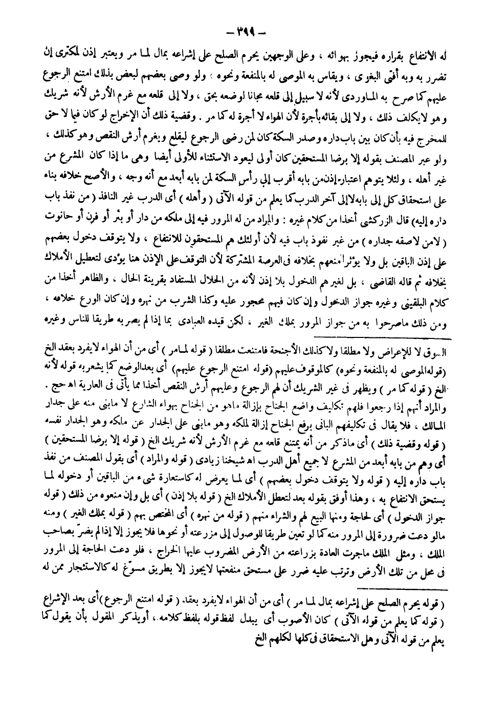 ـــــــــــــــــــــــــــــQقَوْلُهُ: يَحْرُمُ الصُّلْحُ عَلَى إشْرَاعِهِ بِمَالٍ لِمَا مَرَّ) أَيْ مِنْ أَنَّ الْهَوَاءَ لَا يُفْرَدُ بِعَقْدٍ. (قَوْلُهُ: امْتَنَعَ الرُّجُوعُ) أَيْ بَعْدَ الْإِشْرَاعِ (قَوْلُهُ: كَمَا يُعْلَمُ مِنْ قَوْلِهِ الْآتِي) كَانَ الْأَصْوَبُ أَنْ يُبَدِّلَ لَفْظَ قَوْلِهِ بِلَفْظِ كَلَامِهِ، أَوْ يَذْكُرَ الْمَقُولَ بِأَنْ يَقُولَ كَمَا يُعْلَمُ مِنْ قَوْلِهِ الْآتِي وَهَلْ الِاسْتِحْقَاقُ فِي كُلِّهَا لِكُلِّهِمْ إلَخْ