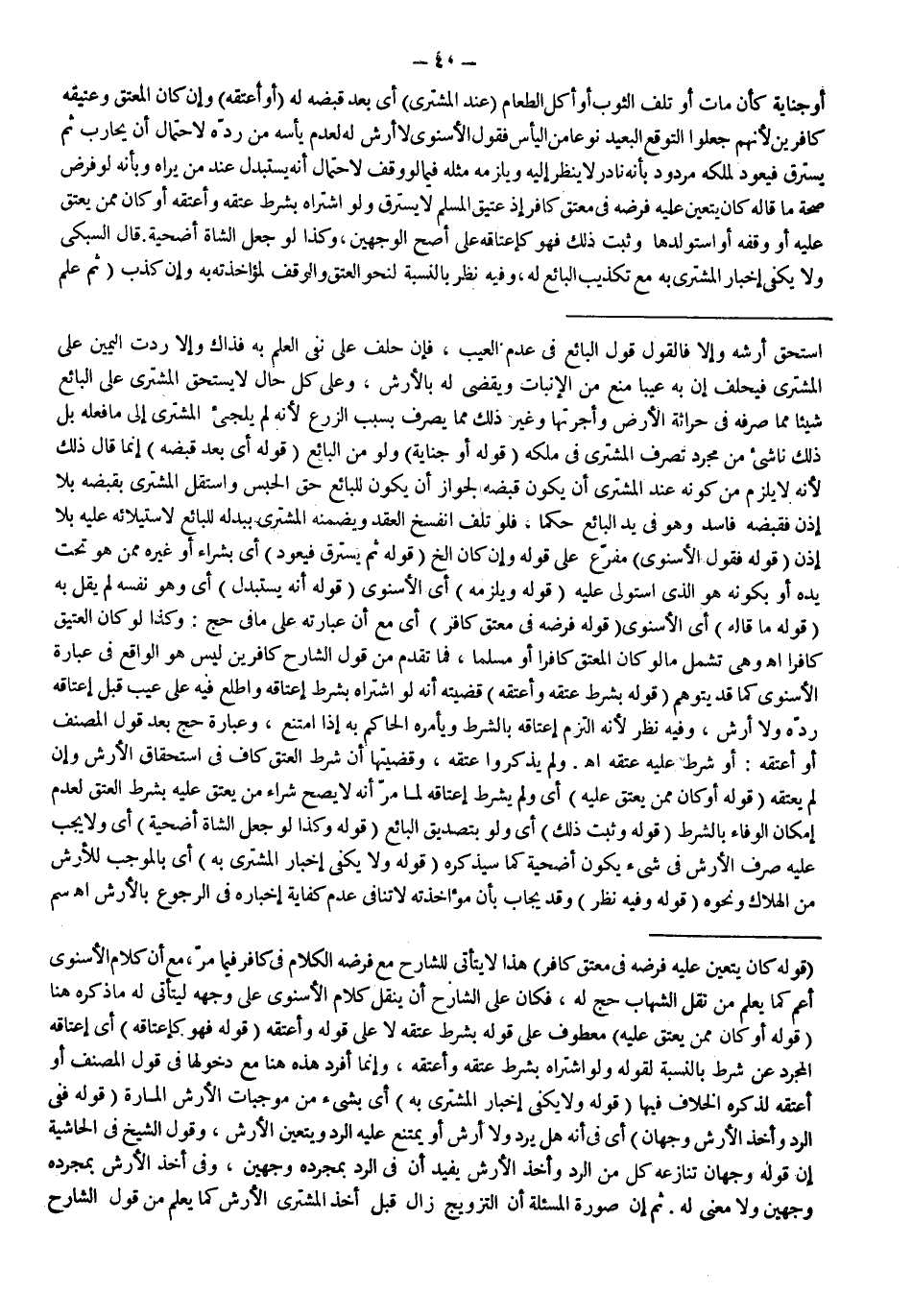 ـــــــــــــــــــــــــــــSاسْتَحَقَّ أَرْشَهُ وَإِلَّا فَالْقَوْلُ قَوْلُ الْبَائِعِ فِي عَدَمِ الْعَيْبِ، فَإِنْ حَلَفَ عَلَى نَفْيِ الْعِلْمِ بِهِ فَذَاكَ وَإِلَّا رُدَّتْ الْيَمِينُ عَلَى الْمُشْتَرِي فَيَحْلِفُ إنَّ بِهِ عَيْبًا مَنَعَ مِنْ الْإِنْبَاتِ وَيَقْضِي لَهُ بِالْأَرْشِ، وَعَلَى كُلِّ حَالٍ لَا يَسْتَحِقُّ الْمُشْتَرِي عَلَى الْبَائِعِ شَيْئًا مِمَّا صَرَفَهُ فِي حِرَاثَةِ الْأَرْضِ وَأُجْرَتِهَا وَغَيْرِ ذَلِكَ مِمَّا يُصْرَفُ بِسَبَبِ الزَّرْعِ لِأَنَّهُ لَمْ يُلْجِئْ الْمُشْتَرِي إلَى مَا فَعَلَهُ بَلْ ذَلِكَ نَاشِئٌ مِنْ مُجَرَّدِ تَصَرُّفِ الْمُشْتَرِي فِي مِلْكِهِ (قَوْلُهُ: أَوْ جِنَايَةً) وَلَوْ مِنْ الْبَائِعِ (قَوْلُهُ: أَيْ بَعْدَ قَبْضِهِ) إنَّمَا قَالَ ذَلِكَ لِأَنَّهُ لَا يَلْزَمُ عَنْ كَوْنِهِ عِنْدَ الْمُشْتَرِي أَنْ يَكُونَ قَبَضَهُ لِجَوَازِ أَنْ يَكُونَ لِلْبَائِعِ حَقُّ الْحَبْسِ وَاسْتَقَلَّ الْمُشْتَرِي بِقَبْضِهِ بِلَا إذْنٍ فَقَبْضُهُ فَاسِدٌ وَهُوَ فِي يَدِ الْبَائِعِ حُكْمًا، فَلَوْ تَلِفَ انْفَسَخَ الْعَقْدُ وَيَضْمَنُهُ الْمُشْتَرِي بِبَدَلِهِ لِلْبَائِعِ لِاسْتِيلَائِهِ عَلَيْهِ بِلَا إذْنٍ (قَوْلُهُ: فَقَوْلُ الْإِسْنَوِيِّ) مُفَرَّعٌ عَلَى قَوْلِهِ وَإِنْ كَانَ إلَخْ (قَوْلُهُ: ثُمَّ يَسْتَرِقُ فَيَعُودُ) أَيْ بِشِرَاءٍ أَوْ غَيْرِهِ مِمَّنْ هُوَ تَحْتَ يَدِهِ أَوْ بِكَوْنِهِ هُوَ الَّذِي اسْتَوْلَى عَلَيْهِ (قَوْلُهُ وَيَلْزَمُهُ) أَيْ الْإِسْنَوِيُّ (قَوْلُهُ: أَنَّهُ يُسْتَبْدَلُ) أَيْ وَهُوَ نَفْسُهُ لَمْ يَقُلْ بِهِ (قَوْلُهُ: مَا قَالَهُ) أَيْ الْإِسْنَوِيُّ (قَوْلُهُ: فَرَضَهُ فِي مُعْتِقِ كَافِرٍ) أَيْ مَعَ أَنَّ عِبَارَتَهُ عَلَى مَا فِي حَجّ: وَكَذَا لَوْ كَانَ الْعَتِيقُ كَافِرًا اهـ وَهِيَ تَشْمَلُ مَا لَوْ كَانَ الْمُعْتَقُ كَافِرًا أَوْ مُسْلِمًا، فَمَا تَقَدَّمَ مِنْ قَوْلِ الشَّارِحِ كَافِرَيْنِ لَيْسَ هُوَ الْوَاقِعُ فِي عِبَارَةِ الْإِسْنَوِيِّ كَمَا قَدْ يُتَوَهَّمُ (قَوْلُهُ بِشَرْطِ عِتْقِهِ وَأَعْتَقَهُ) قَضِيَّتُهُ أَنَّهُ لَوْ اشْتَرَاهُ بِشَرْطِ إعْتَاقِهِ وَاطَّلَعَ فِيهِ عَلَى عَيْبٍ قَبْلَ إعْتَاقِهِ رَدَّهُ وَلَا أَرْشَ، وَفِيهِ نَظَرٌ لِأَنَّهُ الْتَزَمَ إعْتَاقَهُ بِالشَّرْطِ وَيَأْمُرُهُ الْحَاكِمُ بِهِ إذَا امْتَنَعَ، وَعِبَارَةُ حَجّ بَعْدَ قَوْلِ الْمُصَنِّفِ أَوْ أَعْتَقَهُ: أَوْ شَرَطَ عَلَيْهِ عِتْقَهُ اهـ.