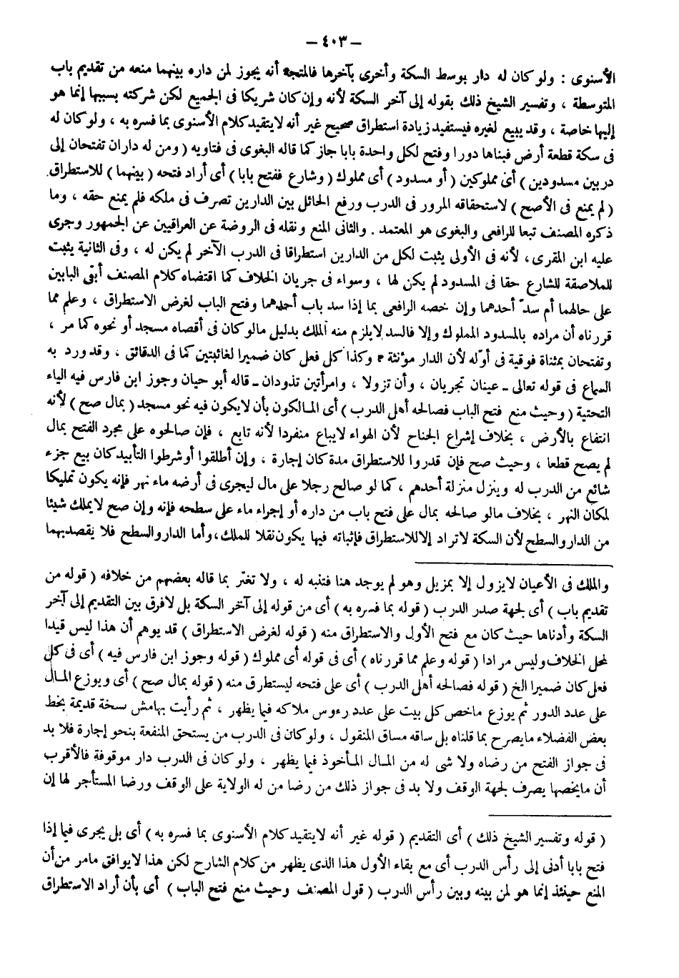 الْإِسْنَوِيُّ: وَلَوْ كَانَ لَهُ دَارٌ بِوَسَطِ السِّكَّةِ وَأُخْرَى بِآخِرِهَا فَالْمُتَّجَهُ أَنَّهُ يَجُوزُ لِمَنْ دَارُهُ بَيْنَهُمَا مَنْعُهُ مِنْ تَقْدِيمِ بَابِ الْمُتَوَسِّطَةِ، وَتَفْسِيرُ الشَّيْخِ ذَلِكَ بِقَوْلِهِ إلَى آخِرِ السِّكَّةِ؛ لِأَنَّهُ وَإِنْ كَانَ شَرِيكًا فِي الْجَمِيعِ لَكِنَّ شَرِكَتَهُ بِسَبَبِهَا إنَّمَا هُوَ إلَيْهَا خَاصَّةً، وَقَدْ يَبِيعُ لِغَيْرِهِ فَيَسْتَفِيدُ زِيَادَةَ اسْتِطْرَاقٍ صَحِيحٍ غَيْرَ أَنَّهُ لَا يَتَقَيَّدُ كَلَامُ الْإِسْنَوِيِّ بِمَا فَسَّرَهُ بِهِ، وَلَوْ كَانَ لَهُ فِي سِكَّةٍ قِطْعَةُ أَرْضٍ فَبَنَاهَا دُورًا وَفَتَحَ لِكُلِّ وَاحِدَةٍ بَابًا جَازَ كَمَا قَالَهُ الْبَغَوِيّ فِي فَتَاوِيهِ (وَمَنْ) (لَهُ دَارَانِ تُفْتَحَانِ إلَى دَرْبَيْنِ مَسْدُودَيْنِ) أَيْ مَمْلُوكَيْنِ (أَوْ مَسْدُودٍ) أَيْ مَمْلُوكٍ (وَشَارِعٍ فَفَتَحَ بَابًا) أَيْ أَرَادَ فَتْحَهُ (بَيْنَهُمَا) لِلِاسْتِطْرَاقِ (لَمْ يُمْنَعْ فِي الْأَصَحِّ) لِاسْتِحْقَاقِهِ الْمُرُورَ فِي الدَّرْبِ وَرَفْعَ الْحَائِلِ بَيْنَ الدَّارَيْنِ تَصَرَّفَ فِي مِلْكِهِ فَلَمْ يُمْنَعْ حَقَّهُ، وَمَا ذَكَرَهُ الْمُصَنِّفُ تَبَعًا لِلرَّافِعِيِّ وَالْبَغَوِيِّ هُوَ الْمُعْتَمَدُ.