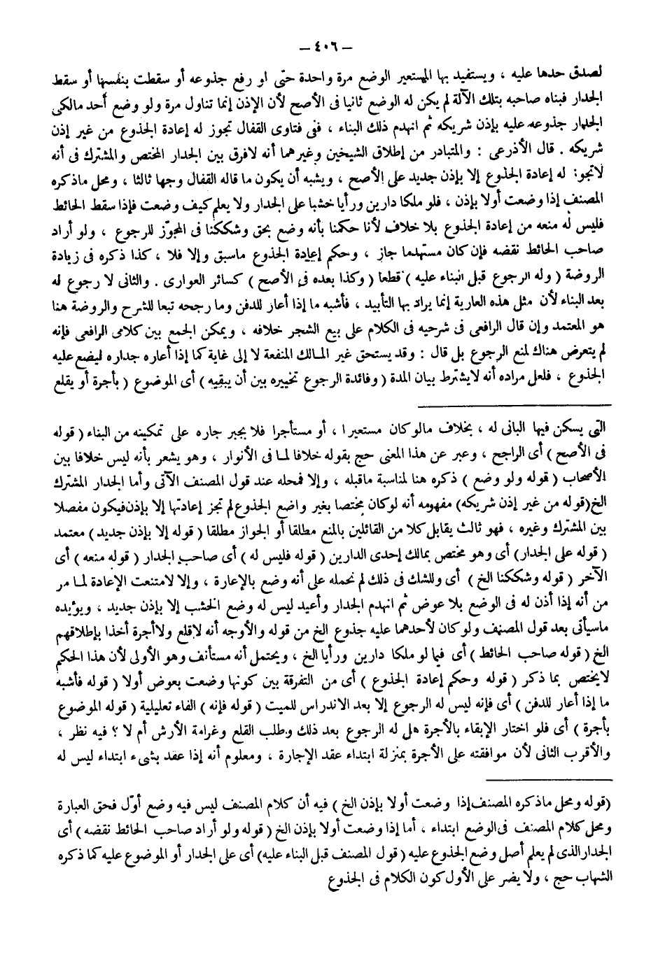 قَالَ الْأَذْرَعِيُّ: وَالْمُتَبَادِرُ مِنْ إطْلَاقِ الشَّيْخَيْنِ وَغَيْرِهِمَا أَنَّهُ لَا فَرْقَ بَيْنَ الْجِدَارِ الْمُخْتَصِّ وَالْمُشْتَرَكِ فِي أَنَّهُ لَا تَجُوزُ لَهُ إعَادَةُ الْجُذُوعِ إلَّا بِإِذْنٍ جَدِيدٍ عَلَى الْأَصَحِّ، وَيُشْبِهُ أَنْ يَكُونَ مَا قَالَهُ الْقَفَّالُ وَجْهًا ثَالِثًا، وَمَحَلُّ مَا ذَكَرَهُ الْمُصَنِّفُ إذَا وُضِعَتْ أَوَّلًا بِإِذْنٍ، فَلَوْ مَلَكَا دَارَيْنِ وَرَأَيَا خَشَبًا عَلَى الْجِدَارِ وَلَا يُعْلَمُ كَيْفَ وُضِعَتْ فَإِذَا سَقَطَ الْحَائِطُ فَلَيْسَ لَهُ مَنْعُهُ مِنْ إعَادَةِ الْجُذُوعِ بِلَا خِلَافٍ؛ لِأَنَّا حَكَمْنَا بِأَنَّهُ وُضِعَ بِحَقٍّ وَشَكَكْنَا فِي الْمُجَوَّزِ لِلرُّجُوعِ، وَلَوْ أَرَادَ صَاحِبُ الْحَائِطِ نَقْضَهُ فَإِنْ كَانَ مُسْتَهْدَمًا جَازَ، وَحُكْمُ إعَادَةِ الْجُذُوعِ مَا سَبَقَ وَإِلَّا فَلَا، كَذَا ذَكَرَهُ فِي زِيَادَةِ الرَّوْضَةِ. (وَلَهُ الرُّجُوعُ قَبْلَ الْبِنَاءِ عَلَيْهِ) قَطْعًا (وَكَذَا بَعْدَهُ فِي الْأَصَحِّ) كَسَائِرِ الْعَوَارِيّ.