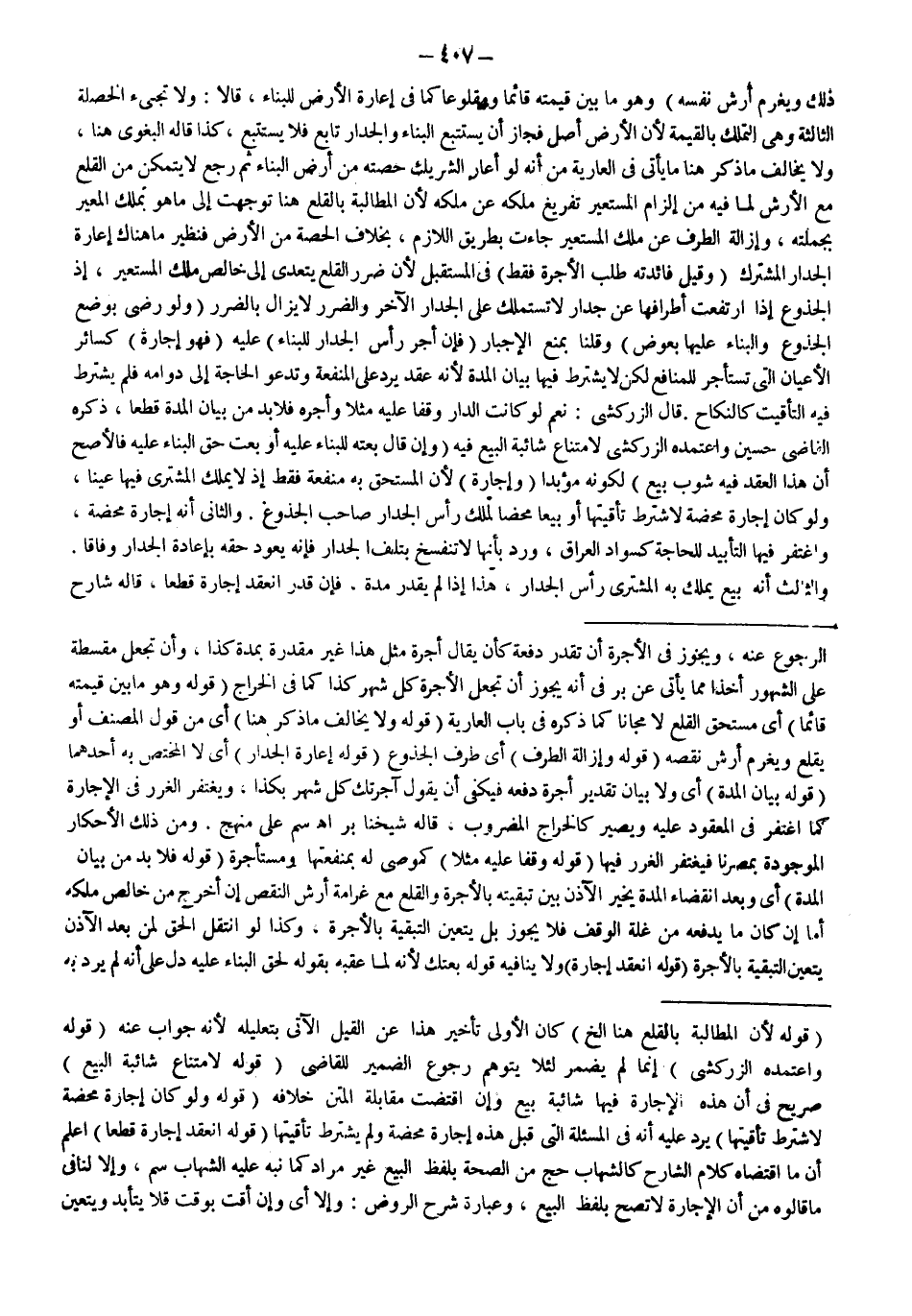 قَالَ الزَّرْكَشِيُّ: نَعَمْ لَوْ كَانَتْ الدَّارُ وَقْفًا عَلَيْهِ مَثَلًا وَأَجَّرَهُ فَلَا بُدَّ مِنْ بَيَانِ الْمُدَّةِ قَطْعًا، ذَكَرَهُ الْقَاضِي حُسَيْنٌ وَاعْتَمَدَهُ الزَّرْكَشِيُّ لِامْتِنَاعِ شَائِبَةِ الْبَيْعِ فِيهِ (وَإِنْ قَالَ بِعْته لِلْبِنَاءِ عَلَيْهِ أَوْ بِعْت حَقَّ الْبِنَاءِ عَلَيْهِ فَالْأَصَحُّ أَنَّ هَذَا الْعَقْدَ فِيهِ شَوْبُ بَيْعٍ) لِكَوْنِهِ مُؤَبَّدًا (وَإِجَارَةٌ) ؛ لِأَنَّ الْمُسْتَحَقَّ بِهِ مَنْفَعَةٌ فَقَطْ؛ إذْ لَا يَمْلِكُ الْمُشْتَرِي فِيهَا عَيْنًا، وَلَوْ كَانَ إجَارَةً مَحْضَةً لَاشْتُرِطَ تَأْقِيتُهَا أَوْ بَيْعًا مَحْضًا لَمَلَكَ رَأْسَ الْجِدَارِ صَاحِبُ الْجُذُوعِ.