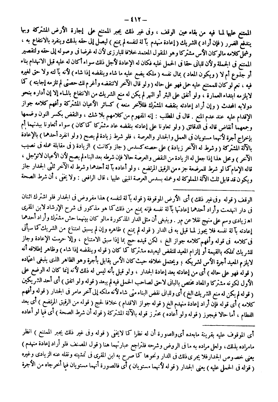 الْمُمْتَنِعُ عَلَيْهَا لِمَا فِيهِ مِنْ بَقَاءِ عَيْنِ الْوَقْفِ، وَفِي غَيْرِ ذَلِكَ يُجْبَرُ الْمُمْتَنِعُ عَلَى إجَارَةِ الْأَرْضِ الْمُشْتَرَكَةِ وَبِهَا يَنْدَفِعُ الضَّرَرُ (فَإِنْ أَرَادَ) الشَّرِيكُ (إعَادَةَ مُنْهَدِمٍ بِآلَةٍ لِنَفْسِهِ لَمْ يُمْنَعْ) لِيَصِلَ إلَى حَقِّهِ بِذَلِكَ وَيَنْفَرِدَ بِالِانْتِفَاعِ بِهِ، وَشَمَلَ كَلَامُهُ مَا لَوْ كَانَ الْأُسُّ مُشْتَرَكًا، وَهُوَ الْمَنْقُولُ الْمُعْتَمَدُ خِلَافًا لِلْبَارِزِيِّ؛ لِأَنَّ لَهُ غَرَضًا فِي وُصُولِهِ إلَى حَقِّهِ وَلِتَقْصِيرِ الْمُمْتَنِعِ فِي الْجُمْلَةِ وَلِأَنَّ لِلْبَانِي حَقًّا فِي الْحَمْلِ عَلَيْهِ فَكَانَ لَهُ الْإِعَادَةُ لِأَجْلِ ذَلِكَ سَوَاءٌ أَكَانَ لَهُ عَلَيْهِ قَبْلَ الِانْهِدَامِ بِنَاءٌ أَوْ جُذُوعٌ أَمْ لَا (وَيَكُونُ الْمُعَادُ) بِمَالِ نَفْسِهِ (مِلْكَهُ يَضَعُ عَلَيْهِ مَا شَاءَ وَيَنْقُضُهُ إذَا شَاءَ) ؛ لِأَنَّهُ بِآلَتِهِ وَلَا حَقَّ لِغَيْرِهِ فِيهِ، نَعَمْ لَوْ كَانَ لِلْمُمْتَنَعِ عَلَيْهِ حَمْلٌ فَهُوَ عَلَى حَالِهِ (وَلَوْ قَالَ الْآخَرُ: لَا تَنْقُضْهُ وَأَغْرَمُ لَك حِصَّتِي) (لَمْ تَلْزَمْهُ إجَابَتُهُ) كَمَا لَا يَلْزَمُهُ ابْتِدَاءُ الْعِمَارَةِ، وَلَوْ أَنْفَقَ عَلَى الْبِئْرِ أَوْ النَّهْرِ لَمْ يَكُنْ لَهُ مَنْعُ الشَّرِيكِ مِنْ الِانْتِفَاعِ بِالْمَاءِ إلَّا إنْ أَدَارَهُ بِنَحْوِ دُولَابِهِ الْمُحْدَثِ (وَإِنْ أَرَادَ إعَادَتَهُ بِنَقْضِهِ الْمُشْتَرَكَ فَلِلْآخَرِ مَنْعُهُ) كَسَائِرِ الْأَعْيَانِ الْمُشْتَرَكَةِ، وَأَفْهَمَ كَلَامُهُ جَوَازَ الْإِقْدَامِ عَلَيْهِ عِنْدَ عَدَمِ الْمَنْعِ.