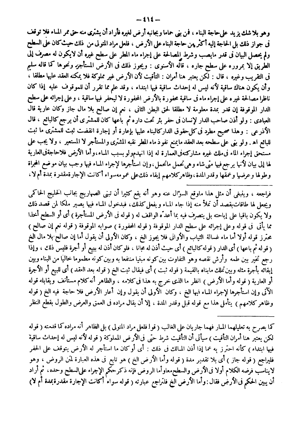 وَهُوَ بِلَا شَكٍّ يَزِيدُ عَلَى حَاجَةِ الْبِنَاءِ، فَمَنْ بَنَى حَمَّامًا وَبِجَانِبِهِ أَرْضٌ لِغَيْرِهِ فَأَرَادَ أَنْ يَشْتَرِيَ مِنْهُ حَقَّ مَمَرِّ الْمَاءِ فَلَا تَوَقُّفَ فِي جَوَازِ ذَلِكَ بَلْ الْحَاجَةُ إلَيْهِ أَكْثَرُ مِنْ حَاجَةِ الْبِنَاءِ عَلَى الْأَرْضِ، فَلَعَلَّ مُرَادَ الْمُتَوَلِّي مِنْ ذَلِكَ حَيْثُ كَانَ عَلَى السَّطْحِ، وَلَمْ يَحْصُلْ الْبَيَانُ فِي قَدْرِ مَا يُصَبُّ وَشَرْطُ الْمُصَالَحَةِ عَلَى إجْرَاءِ مَاءِ الْمَطَرِ عَلَى سَطْحِ غَيْرِهِ أَنْ لَا يَكُونَ لَهُ مَصْرِفٌ إلَى الطَّرِيقِ إلَّا بِمُرُورِهِ عَلَى سَطْحِ جَارِهِ، قَالَهُ الْإِسْنَوِيُّ: وَيَجُوزُ ذَلِكَ فِي الْأَرْضِ الْمُسْتَأْجَرَةِ وَنَحْوِهَا كَمَا قَالَهُ سُلَيْمٌ فِي التَّقْرِيبِ وَغَيْرِهِ، قَالَ: لَكِنْ يُعْتَبَرُ هُنَا أَمْرَانِ: التَّأْقِيتُ؛ لِأَنَّ الْأَرْضَ غَيْرُ مَمْلُوكَةٍ فَلَا يُمْكِنُهُ الْعَقْدُ عَلَيْهَا مُطْلَقًا، وَأَنْ يَكُونَ هُنَاكَ سَاقِيَةٌ؛ لِأَنَّهُ لَيْسَ لَهُ إحْدَاثُ سَاقِيَةٍ فِيهَا ابْتِدَاءً، وَقَدْ عُلِمَ مِمَّا تَقَرَّرَ أَنَّ لِلْمَوْقُوفِ عَلَيْهِ إذَا كَانَ نَاظِرًا مُصَالَحَةَ غَيْرِهِ عَلَى إجْرَاءِ مَاءٍ فِي سَاقِيَةٍ مَحْفُورَةٍ بِالْأَرْضِ الْمَحْفُورَةِ لَا لِيَحْفِرَ فِيهَا سَاقِيَةً، وَعَلَى إجْرَائِهِ عَلَى سَطْحِ الدَّارِ الْمَوْقُوفَةِ إنْ قُدِّرَ بِمُدَّةٍ مَعْلُومَةٍ لَا مُطْلَقًا لِحَقِّ الْبَطْنِ الثَّانِي، نَعَمْ إنْ صَالَحَ بِلَا مَالٍ جَازَ، وَكَانَ عَارِيَّةً قَالَ الْعَبَّادِيُّ: وَلَوْ أَذِنَ صَاحِبُ الدَّارِ لِإِنْسَانٍ فِي حَفْرِ بِئْرٍ تَحْتَ دَارِهِ ثُمَّ بَاعَهَا كَانَ لِلْمُشْتَرِي أَنْ يَرْجِعَ كَالْبَائِعِ، قَالَ الْأَذْرَعِيُّ: وَهَذَا صَحِيحٌ مُطَّرِدٌ فِي كُلِّ حُقُوقِ الدَّارِ كَالْبِنَاءِ عَلَيْهَا بِإِعَارَةٍ أَوْ إجَارَةٍ انْقَضَتْ ثَبَتَ لِلْمُشْتَرِي مَا ثَبَتَ لِلْبَائِعِ اهـ.