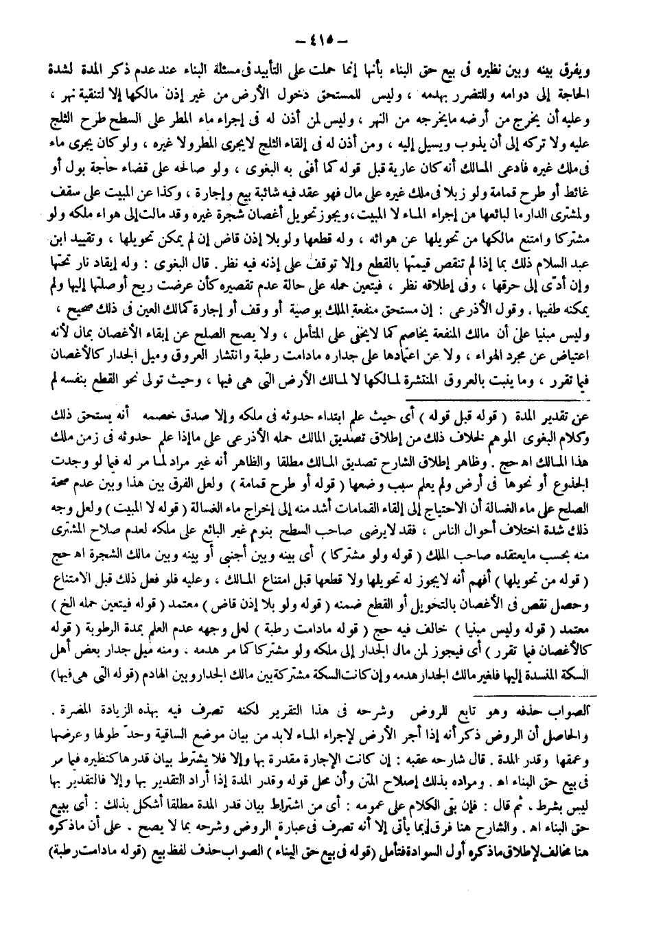 وَالشَّارِحُ هُنَا فَرَّقَ بِمَا يَأْتِي إلَّا أَنَّهُ تَصَرَّفَ فِي عِبَارَةِ الرَّوْضِ وَشَرْحِهِ بِمَا لَا يَصِحُّ، عَلَى أَنَّ مَا ذَكَرَهُ هُنَا مُخَالِفٌ لِإِطْلَاقِ مَا ذَكَرَهُ أَوَّلَ السَّوَادَةِ فَتَأَمَّلْ. (قَوْلُهُ: فِي بَيْعِ حَقِّ الْبِنَاءِ) الصَّوَابُ حَذْفُ لَفْظِ بَيْعِ.