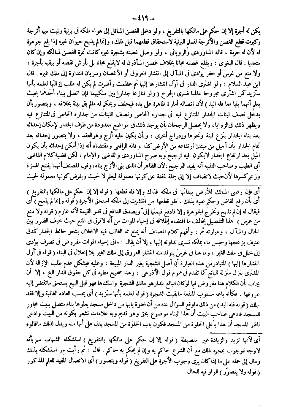 يَكُنْ لَهُ أُجْرَةٌ إلَّا إنْ حَكَمَ عَلَى مَالِكِهَا بِالتَّفْرِيغِ، وَلَوْ دَخَلَ الْغُصْنُ الْمَائِلُ إلَى هَوَاءِ مِلْكِهِ فِي بَرْنِيَّةِ وَنَبَتَ فِيهَا أُتْرُجَّةٌ وَكَبِرَتْ قَطَعَ الْغُصْنَ وَالْأُتْرُجَّةَ لِتَسْلَمَ الْبَرْنِيَّةُ لِاسْتِحْقَاقِ قَطْعِهِمَا قَبْلَ ذَلِكَ، وَإِنَّمَا لَمْ يُذْبَحْ حَيَوَانُ غَيْرِهِ إذَا بَلَعَ جَوْهَرَةً لَهُ؛ لِأَنَّ لَهُ حُرْمَةً، قَالَهُ الْمَاوَرْدِيُّ وَالرُّويَانِيُّ، وَلَوْ وَصَلَ غُصْنَهُ بِشَجَرَةِ غَيْرِهِ كَانَتْ ثَمَرَةُ الْغُصْنِ لِمَالِكِهِ وَإِنْ كَانَ مُتَعَدِّيًا.
