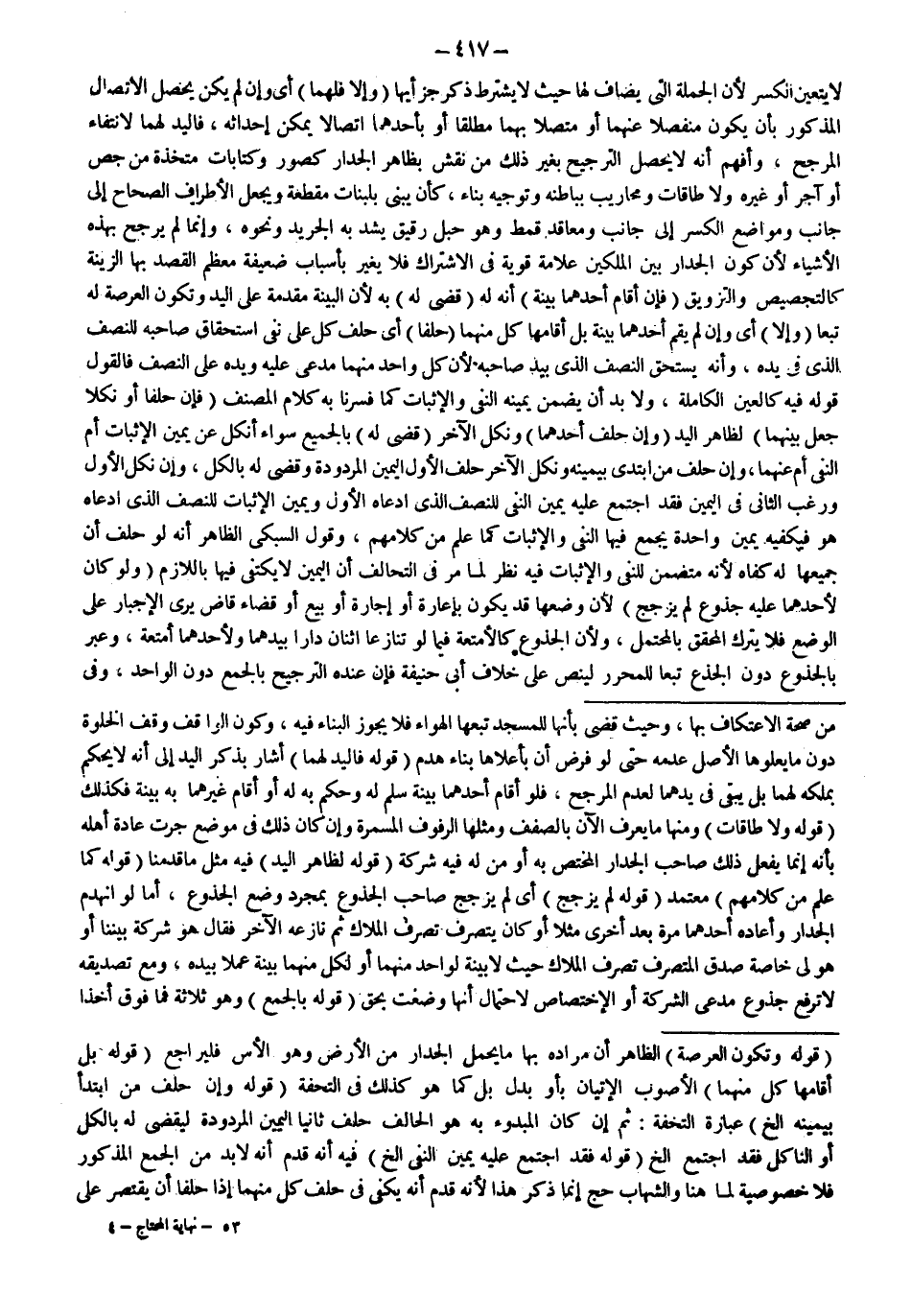 لَا يَتَعَيَّنُ الْكَسْرُ؛ لِأَنَّ الْجُمْلَةَ الَّتِي يُضَافُ لَهَا حَيْثُ لَا يُشْتَرَطُ ذِكْرُ جُزْأَيْهَا (وَإِلَّا فَلَهُمَا) أَيْ: وَإِنْ لَمْ يَكُنْ يَحْصُلُ الِاتِّصَالُ الْمَذْكُورُ بِأَنْ يَكُونَ مُنْفَصِلًا عَنْهُمَا أَوْ مُتَّصِلًا بِهِمَا مُطْلَقًا أَوْ بِأَحَدِهِمَا اتِّصَالًا يُمْكِنُ إحْدَاثُهُ، فَالْيَدُ لَهُمَا لِانْتِفَاءِ الْمُرَجِّحِ، وَأَفْهَمَ أَنَّهُ لَا يَحْصُلُ التَّرْجِيحُ بِغَيْرِ ذَلِكَ مِنْ نَقْشٍ بِظَاهِرِ الْجِدَارِ كَصُوَرٍ وَكِتَابَاتٍ مُتَّخَذَةٍ مِنْ جِصٍّ أَوْ آجُرٍّ أَوْ غَيْرِهِ وَلَا طَاقَاتٍ وَمَحَارِيبَ بِبَاطِنِهِ وَتَوْجِيهِ بِنَاءٍ، كَأَنْ يَبْنِيَ بِلَبِنَاتٍ مُقَطَّعَةٍ وَيَجْعَلَ الْأَطْرَافَ الصِّحَاحَ إلَى جَانِبٍ وَمَوَاضِعَ الْكَسْرِ إلَى جَانِبٍ وَمَعَاقِدَ قُمُطٍ وَهُوَ حَبْلٌ رَقِيقٌ يُشَدُّ بِهِ الْجَرِيدُ وَنَحْوُهُ